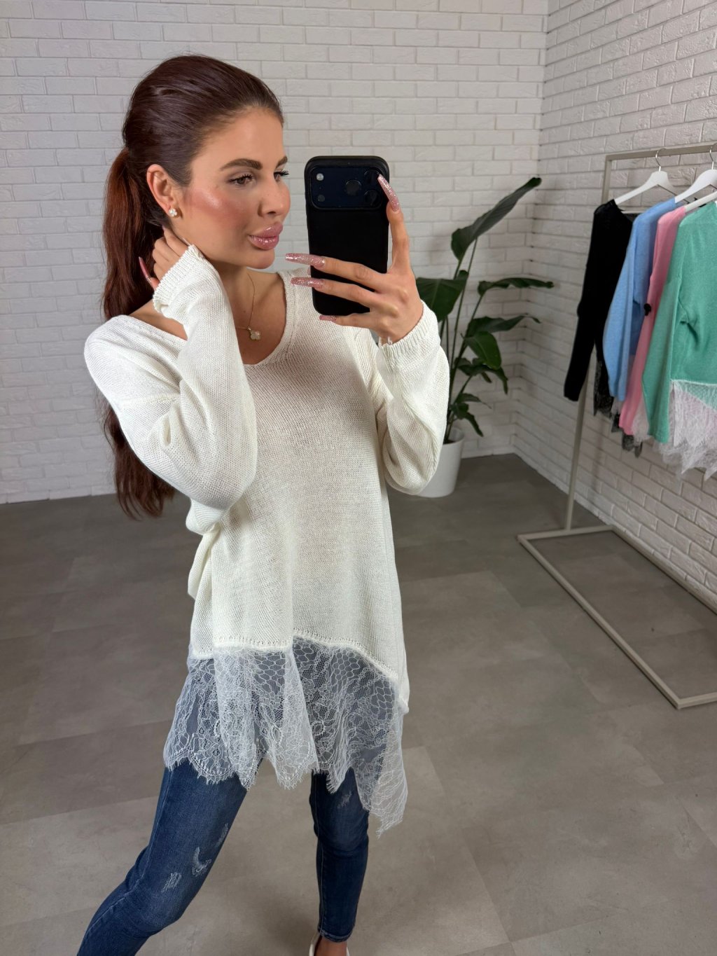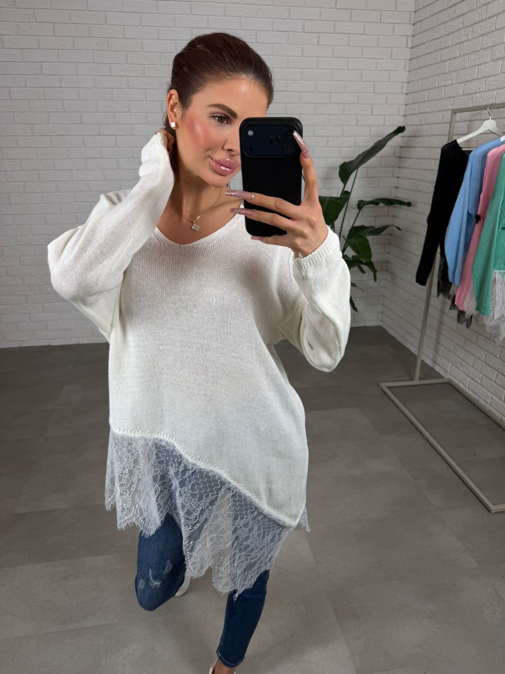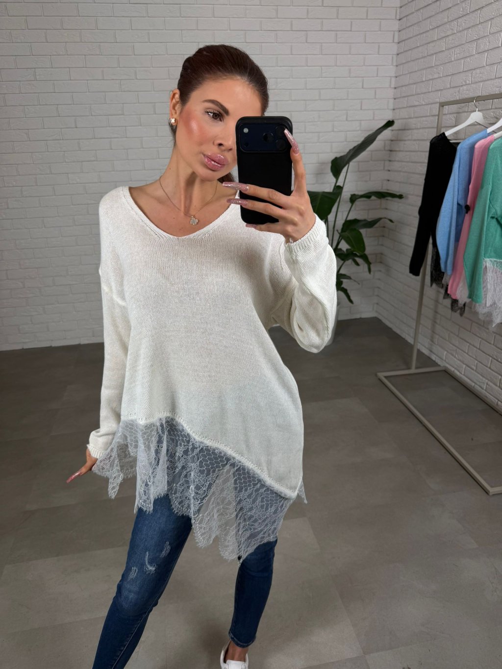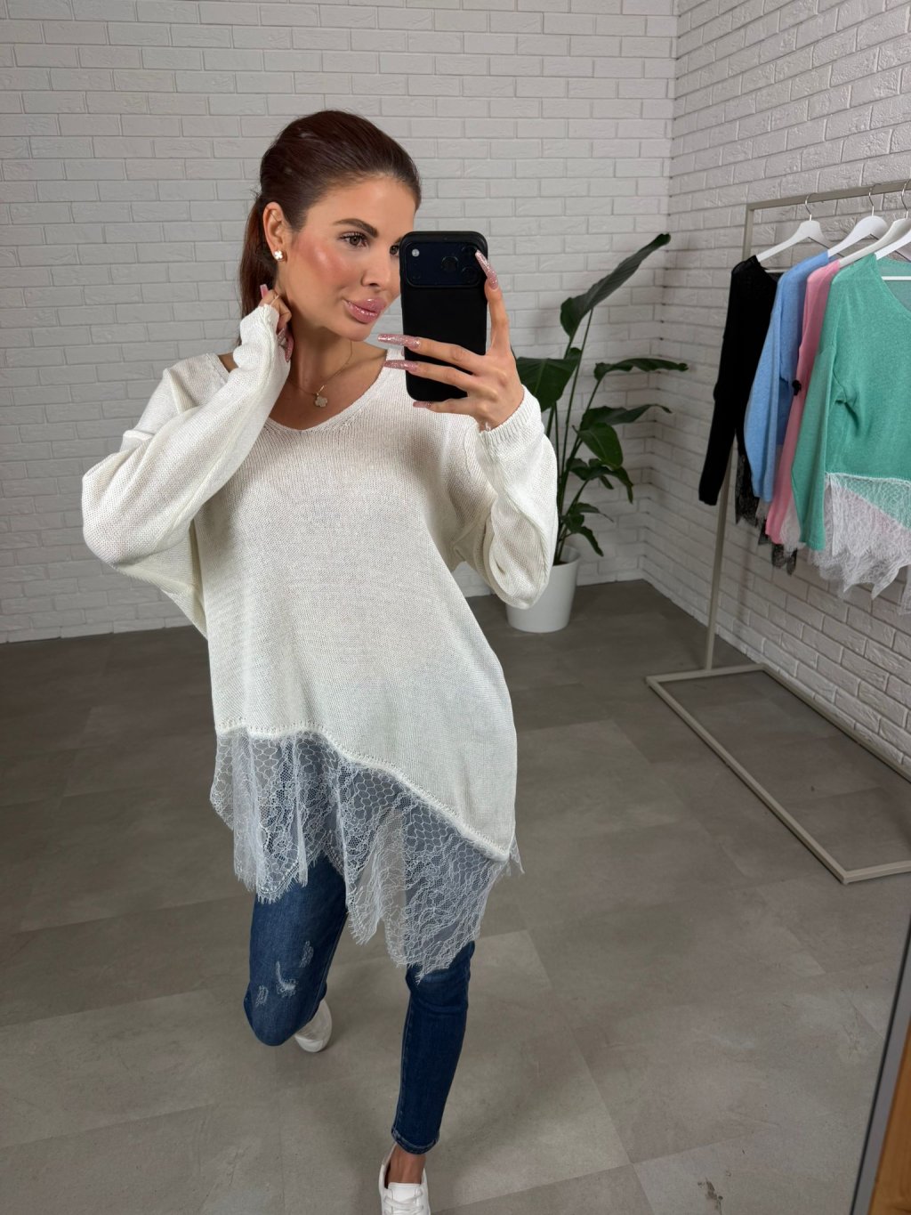Asymetrický sveter NOREN je vyrobený z príjemného mäkkého materiálu, ktorý je jemný na dotyk a veľmi pohodlný počas celého dňa. Materiál pôsobí ľahko, no zároveň si drží svoj tvar a vytvára upravený, ženský vzhľad bez zbytočného objemu. Vďaka voľnejšiemu strihu krásne splýva na postave, neobopína problémové partie a prirodzene zakryje oblasť bruška aj bokov, čím vytvára vyváženú siluetu. Dominantným detailom je asymetrické zakončenie doplnené o jemnú čipku, ktorá dodáva svetru romantický a originálny nádych. Tento detail pôsobí veľmi žensky a zároveň robí z jednoduchého kúsku niečo výnimočné. Výstrih do tvaru V opticky predlžuje krk a pôsobí elegantne, zatiaľ čo dlhé rukávy zabezpečujú komfort aj počas chladnejších dní. Sveter NOREN je ideálny na každodenné nosenie – skvele sa kombinuje s džínsami, legínami aj elegantnejšími nohavicami. Vďaka univerzálnemu strihu sadne na konfekčné veľkosti XS až L a je vhodný pre rôzne typy postavy. Je to presne ten kúsok, ktorý oživí tvoj šatník a zároveň ti poskytne maximálne pohodlie.