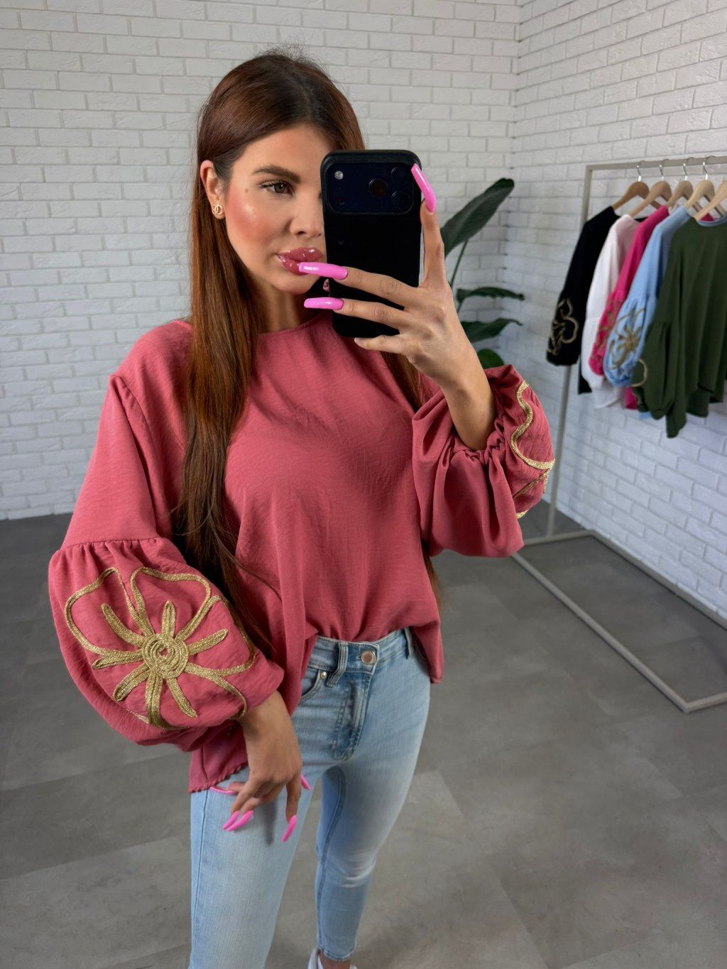 Blúzka SUNNY je ľahký a pohodlný kúsok, ktorý pôsobí jemne a žensky vďaka nadýchaným rukávom doplneným o decentný kvetinový detail. Materiál je nekrčivý a príjemný na nosenie, takže si zachová upravený vzhľad počas celého dňa.