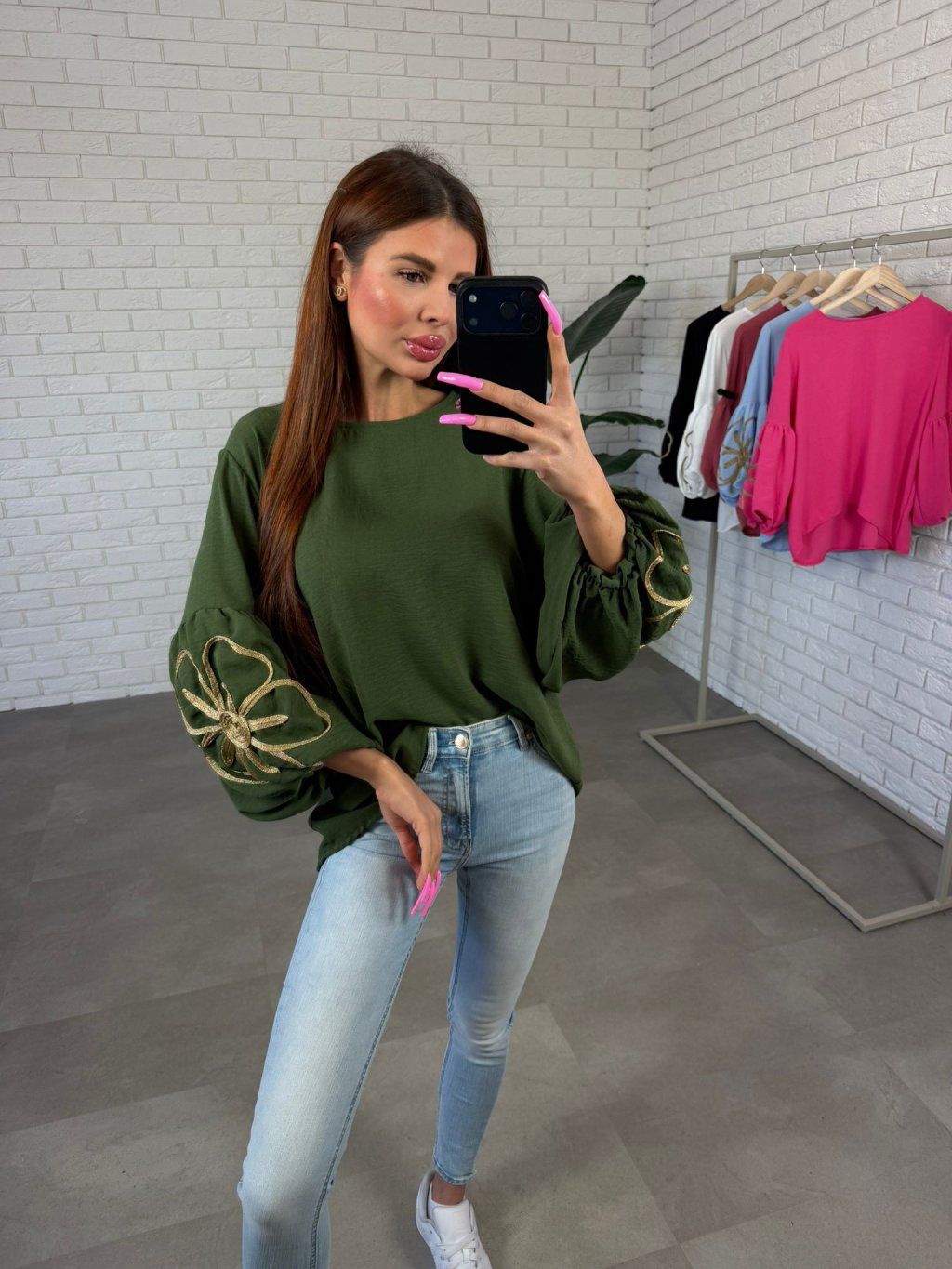 Blúzka SUNNY je ľahký a pohodlný kúsok, ktorý pôsobí jemne a žensky vďaka nadýchaným rukávom doplneným o decentný kvetinový detail. Materiál je nekrčivý a príjemný na nosenie, takže si zachová upravený vzhľad počas celého dňa.