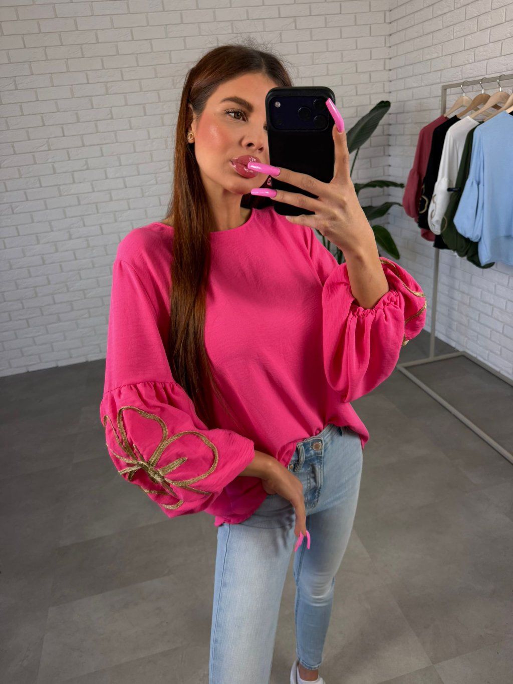 Blúzka SUNNY je ľahký a pohodlný kúsok, ktorý pôsobí jemne a žensky vďaka nadýchaným rukávom doplneným o decentný kvetinový detail.