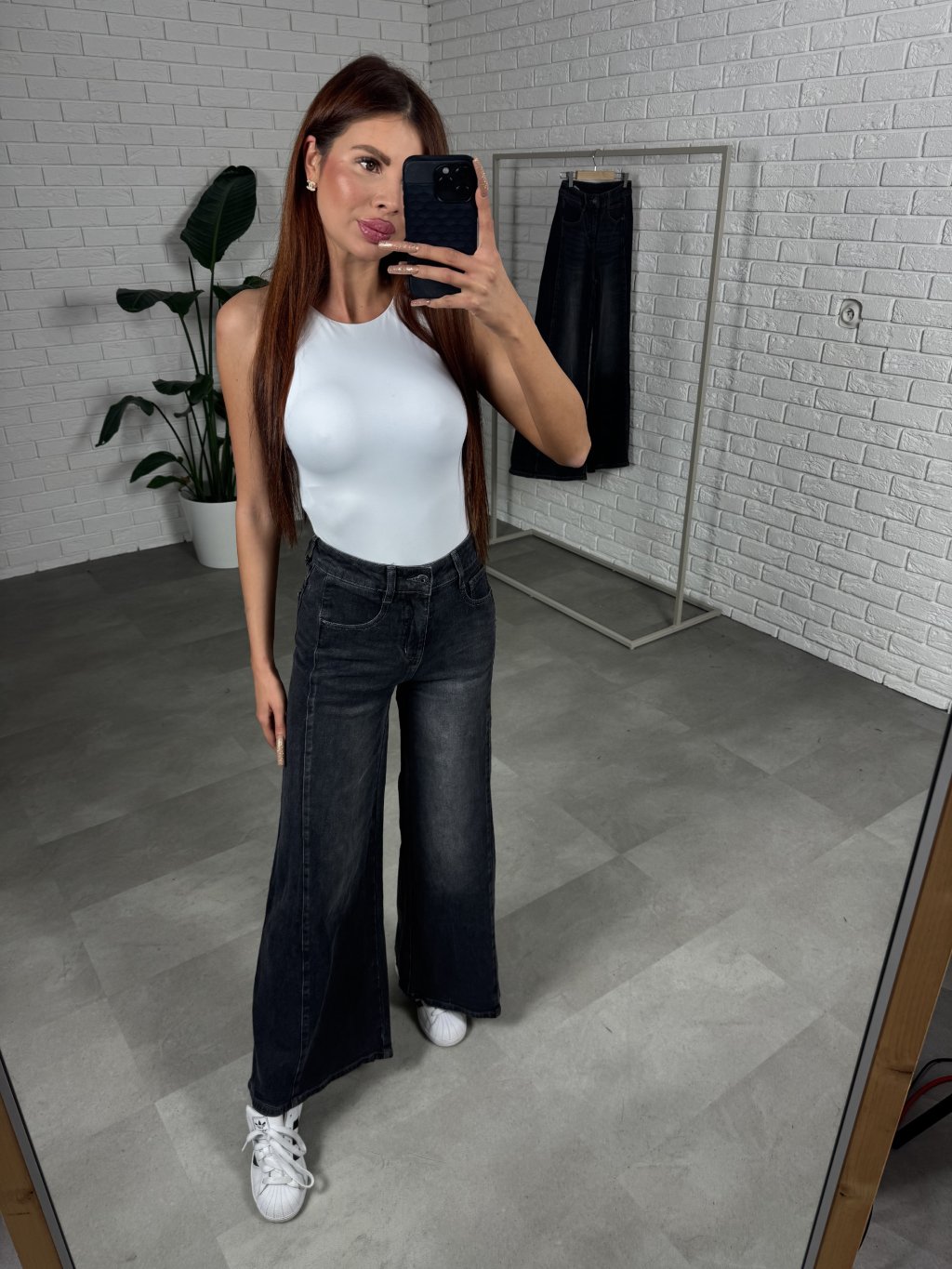 Jeansy NERA sú veľmi trendy kúsok, ktorý má naozaj špičkový materiál, obľubený strih, ktorý krásne opticky dotvorí postavu, hore sú obtiahnuté a dole rozšírené, vysoký pás, krásny detail vo forme prešitia, jemne vyšúchaný efekt, sedia od 160 po 175 cm, veľkosť sedí od XS-XL.