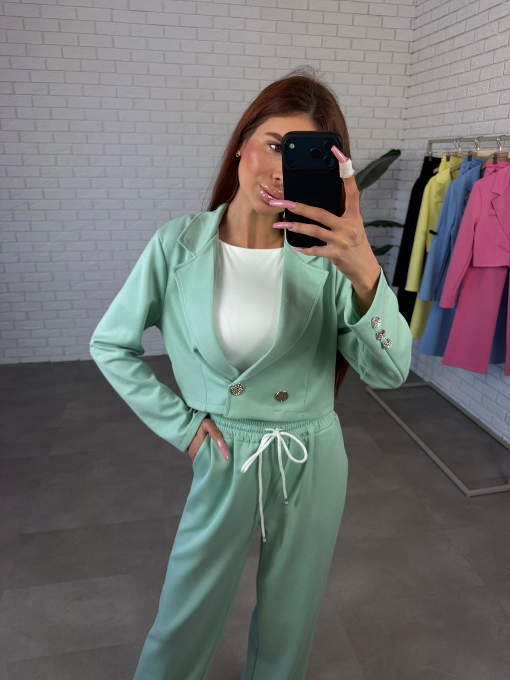 Komplet MELIOR je moderný športovo-elegantný kúsok, ktorý spája pohodlie teplákov s upraveným vzhľadom elegantného outfitu. Vyrobený je z kvalitného poloteplákového materiálu, ktorý je príjemný na nosenie, mäkký na dotyk a zároveň drží pekný tvar počas celého dňa.Komplet sa skladá z kratšieho saka, ktoré siaha približne po pás a krásne zvýrazňuje siluetu. Zapínanie je riešené elegantnými gombíkmi a rovnaké ozdobné gombíky sa nachádzajú aj na rukávoch, čo dodáva modelu štýlový detail. Nohavice majú rovný mierne rozšírený strih, ktorý pôsobí veľmi elegantne a zároveň poskytuje maximálne pohodlie pri pohybe. Po bokoch sa nachádzajú praktické hlboké vrecká, ktoré využiješ pri každodennom nosení. Komplet MELIOR je ideálny na bežné dni, stretnutia aj cestovanie, keď chceš vyzerať upravene, no stále sa cítiť pohodlne. Veľkostne sadne na konfekčné veľkosti od S po L a výškovo je vhodný pre kočky približne do 175 cm.