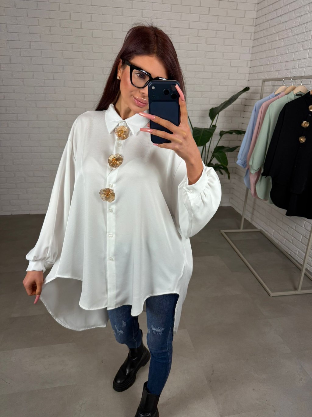 Košeľa ADAM predĺžená s ozdobnými kvietkami, ktoré sa dajú aj odopnúť. Košeľa je v prémiovej kvalite. Vo voľnom rozšírenom strihu. Zadná časť predĺžená, asymetrický strih. Vhodné aj na vyššie kočky. Veľmi nadčasový kúsok, ktorý nesmie chýbať v tvojom šatníku. Sadne na veľkosť od XS po XL.