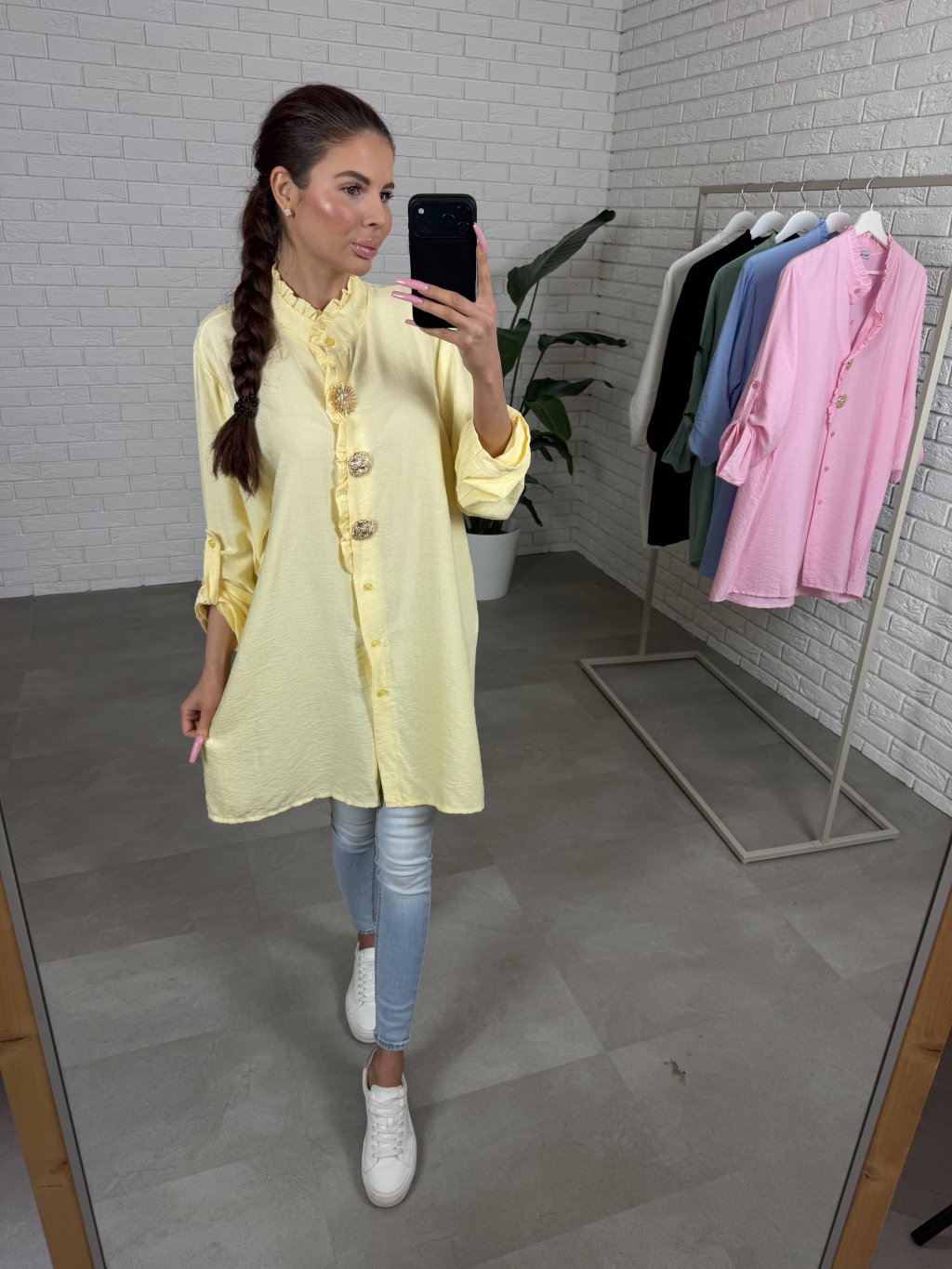 Košeľa ARTOS je voľná ležérna košielka, ktorá je ideálnou voľbou na dni, keď chceš spojiť pohodlie so štýlovým vzhľadom. Vyrobená je z príjemného materiálu, ktorý je mäkký na dotyk a krásne splýva na postave bez nepríjemného obopínania. Predĺžený strih pôsobí moderne, prirodzene zakryje oblasť bokov a zároveň je vhodný aj pre vyššie kočky. Charakteristickým detailom sú tri ozdobné spony, ktoré dodávajú košeli zaujímavý a elegantný nádych, pričom ich môžeš podľa nálady jednoducho odopnúť a prispôsobiť si vzhľad. ARTOS sa skvelo kombinuje s legínami, nohavicami aj džínsami a je ideálnym kúskom na bežné nosenie aj upravenejší každodenný outfit. Veľkostne sedí na konfekčné veľkosti od S po XL.