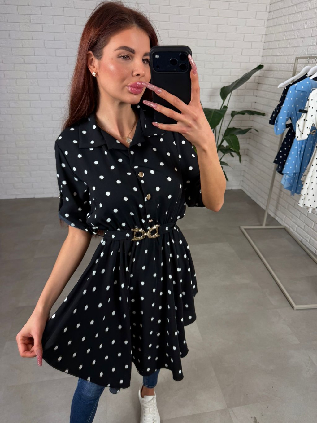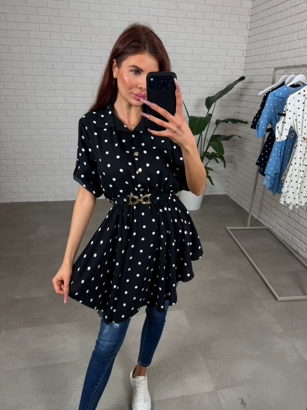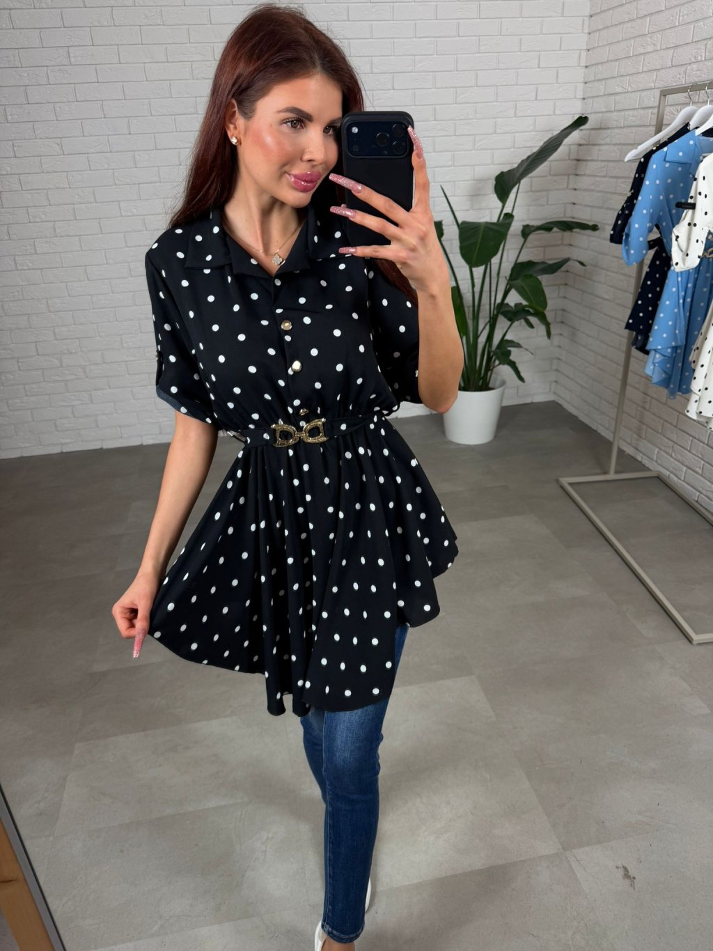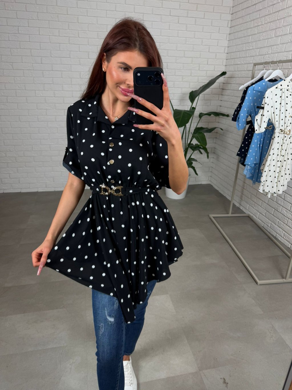 Asymetrická košieľka DOTTY s jarným nádychom, má áčkový strih, ktorý je v páse zúžený s opaskom, ktorý vzadu zdobí mašlička a zamaskuje nedostatky. Jej veľkou výhodou je jej príjemný a nekrčivý materiál. Sadne na konfekčnú veľkosť od S po L.
