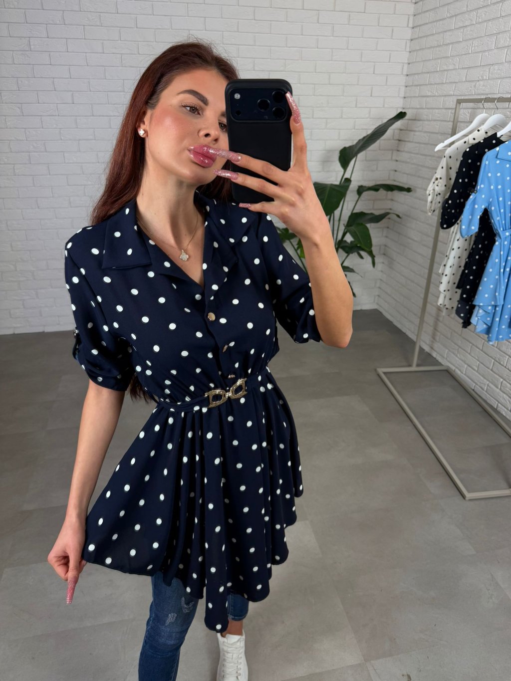 Asymetrická košieľka DOTTY s jarným nádychom, má áčkový strih, ktorý je v páse zúžený s opaskom, ktorý vzadu zdobí mašlička a zamaskuje nedostatky. Jej veľkou výhodou je jej príjemný a nekrčivý materiál. Sadne na konfekčnú veľkosť od S po L.