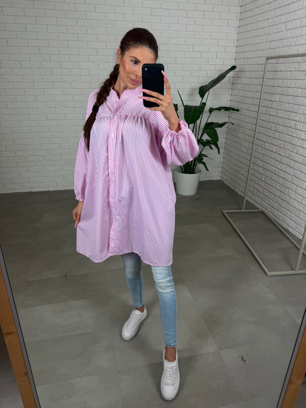 Zvislé pruhy opticky zoštíhľujú a predlžujú siluetu, vďaka čomu pôsobí outfit upravene a žensky bez námahy. Rukávy sú výrazne voľné a zakončené jemnou elastickou gumičkou, ktorá vytvára pekný objem a zároveň zabezpečí pohodlie pri nosení. Vďaka svojej dĺžke je košeľa ideálna nielen ku legínam alebo džínsom, ale môžeš ju nosiť aj samostatne ako ľahké letné šaty. Veľkostne sadne na konfekčné veľkosti M až XL.