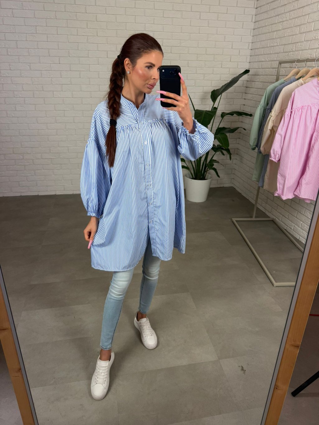 Zvislé pruhy opticky zoštíhľujú a predlžujú siluetu, vďaka čomu pôsobí outfit upravene a žensky bez námahy. Rukávy sú výrazne voľné a zakončené jemnou elastickou gumičkou, ktorá vytvára pekný objem a zároveň zabezpečí pohodlie pri nosení. Vďaka svojej dĺžke je košeľa ideálna nielen ku legínam alebo džínsom, ale môžeš ju nosiť aj samostatne ako ľahké letné šaty. Veľkostne sadne na konfekčné veľkosti M až XL.