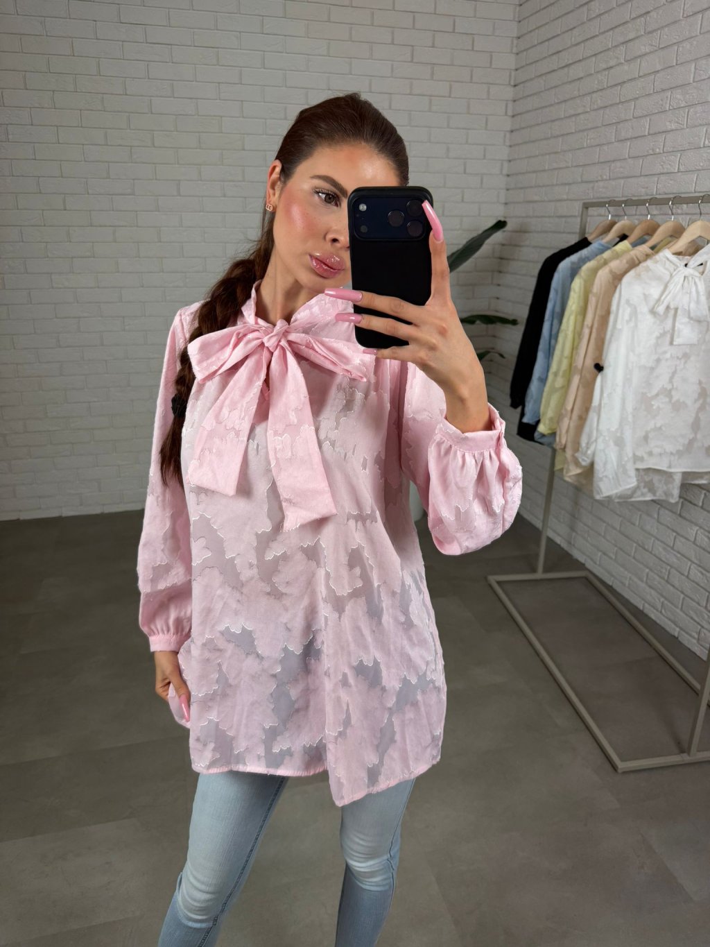 Dominantou je výrazná mašlička pri krku, ktorá pôsobí romanticky a žensky, zatiaľ čo jemné gombíky na rukávoch podčiarkujú celkový sofistikovaný vzhľad. Predĺžený strih zabezpečuje pohodlie a variabilitu stylingu. Blúzku môžeš nosiť voľne spustenú pre ležérny elegantný efekt alebo ju zakasať do nohavíc či sukne a zvýrazniť tak pás.