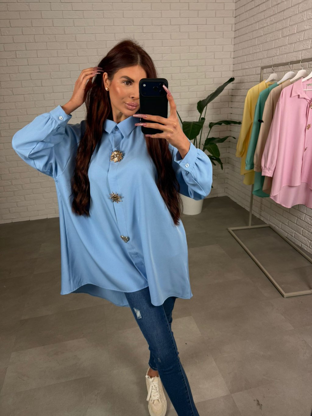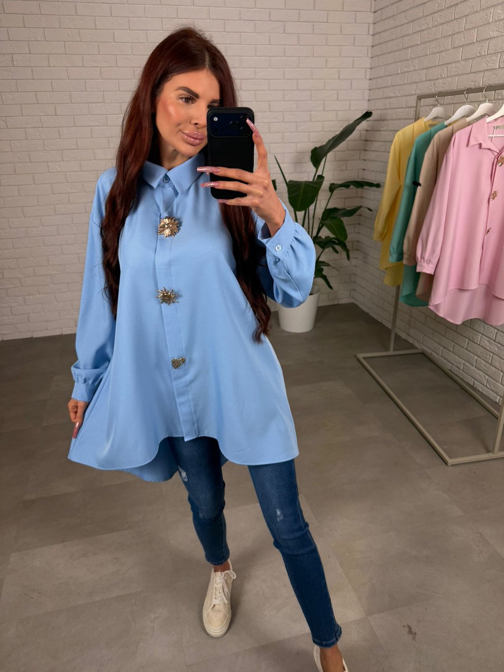 Košeľa OTILIA je ideálnou voľbou pre dámy vo veľkostiach M – XL. Vzdušný a nekrčivý materiál zabezpečuje pohodlie počas celého dňa, zatiaľ čo predĺžený strih krásne splýva a vzadu siaha až ku kolenám. Voľné rukávy pôsobia lichotivo a jemne maskujú paže. Ozdobné brošne na gombíkoch (možno ich odopnúť) dodávajú košeli elegantný nádych a umožňujú variabilné nosenie.
