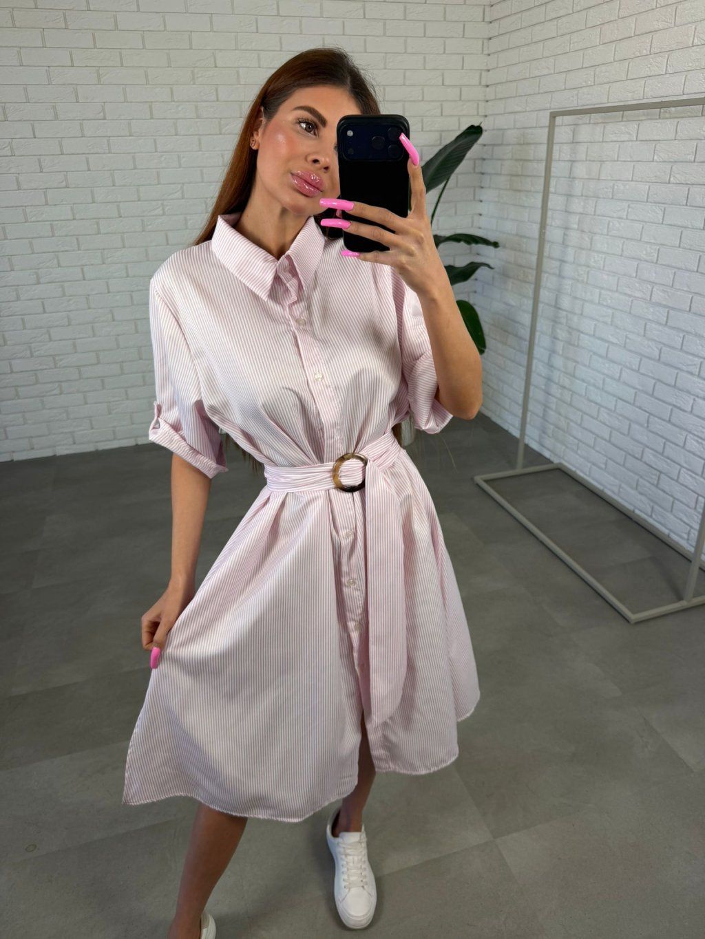 Vzdušný, nadýchaný materiál je veľmi príjemný na nosenie, ľahko sa hýbe spolu s telom a dodáva celému looku uvoľnený, no stále upravený vzhľad. Zvislé pruhy opticky predlžujú siluetu a zároveň vytvárajú jemne zoštíhľujúci efekt. Košeľový strih so zapínaním pôsobí čisto a nadčasovo, zatiaľ čo opasok umožní prispôsobiť šaty presne podľa postavy a pekne zvýrazniť pás.
