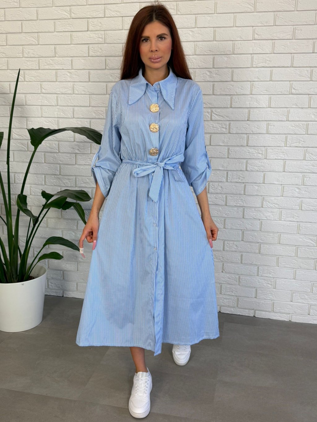 Šaty REMUS sú elegantný košeľový model v midi dĺžke, ktorý pôsobí veľmi žensky a zároveň je mimoriadne pohodlný na nosenie. Voľnejší strih prirodzene splýva na postave a proporčne zakrýva oblasť bokov, pásu, spodného bruška aj zadočku, vďaka čomu vytvára veľmi peknú siluetu. Materiál je ľahký a vzdušný, takže šaty sú ideálne na teplejšie dni. Vzor jemných zvislých prúžkov opticky zoštíhľuje postavu a dodáva modelu upravený, elegantný vzhľad. Vrchnú časť dopĺňa klasický golierik a výrazné zlaté ozdobné brošne, ktoré sú odnímateľné, takže si šaty môžeš prispôsobiť podľa vlastného štýlu. Dlhé rukávy si môžeš pohodlne vyhrnúť podľa potreby. Šaty REMUS sú vhodné najmä pre kočky od výšky približne 165 cm a vďaka voľnému strihu sú ideálne aj pre ženy po pôrode. Veľkostne sadnú na konfekčné veľkosti od S po L.