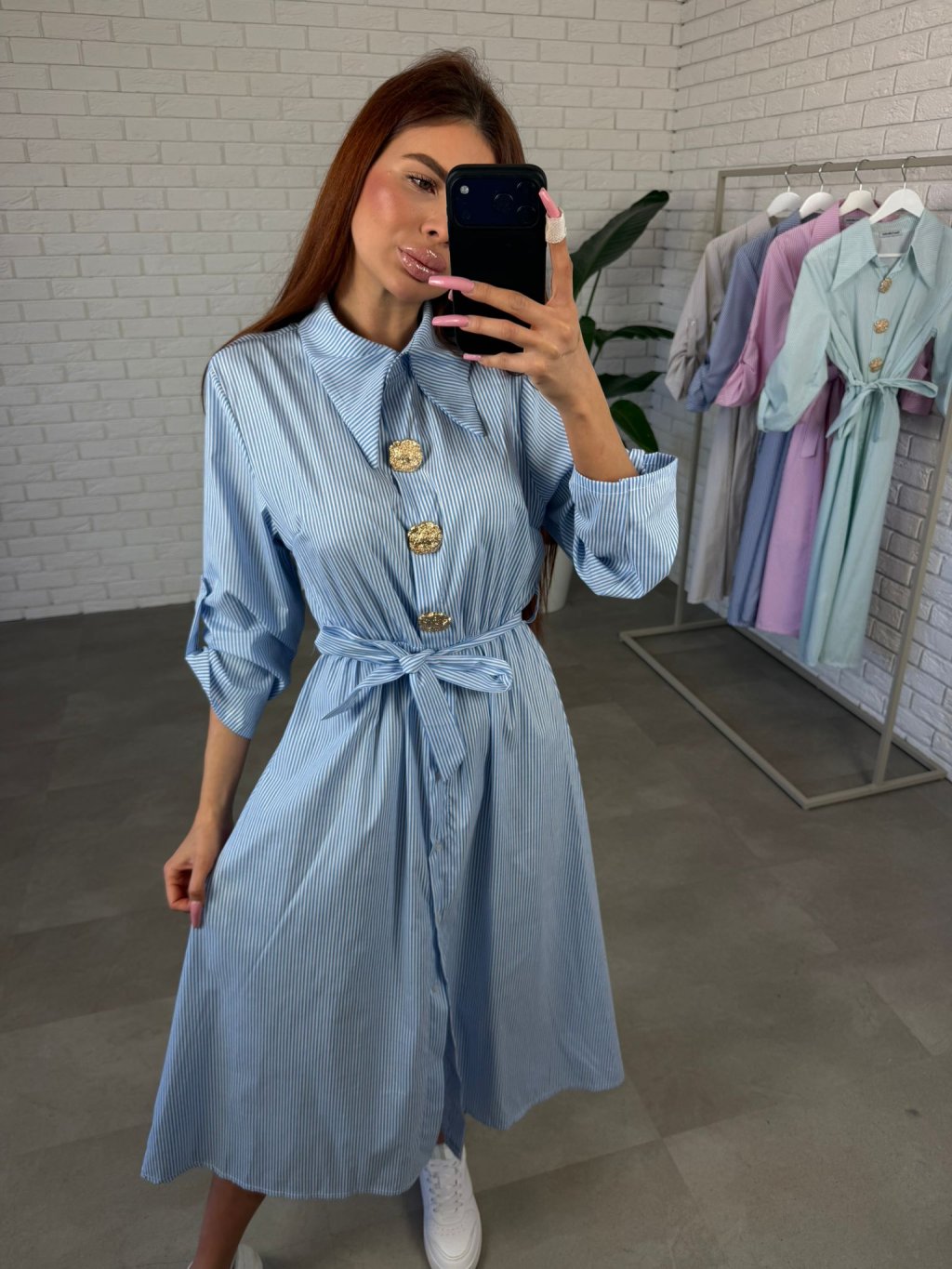 Šaty REMUS sú elegantný košeľový model v midi dĺžke, ktorý pôsobí veľmi žensky a zároveň je mimoriadne pohodlný na nosenie. Voľnejší strih prirodzene splýva na postave a proporčne zakrýva oblasť bokov, pásu, spodného bruška aj zadočku, vďaka čomu vytvára veľmi peknú siluetu.