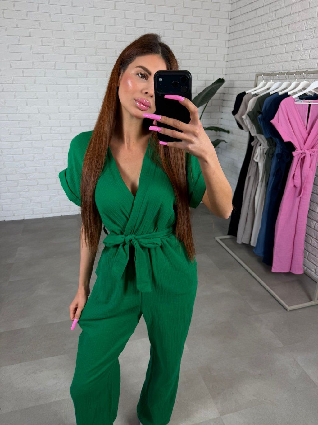 Prekladaný dekolt sa prispôsobí rôznym typom postavy a pekne zvýrazní hornú časť siluety. Pod prsiami sa nachádza elastická guma, ktorá jemne zvýrazní pás a zároveň poskytne dostatok komfortu bez obopínania. Voľnejšie rukávy zabezpečia pohodlie pre každú ručičku a rovný strih nohavíc prirodzene splýva na postave. Nechýbajú ani hlboké vrecká, ktoré oceníš pri každodennom nosení. Overal je ideálny pre nižšie kočky približne do 170 cm a veľkostne sadne od XS po menšie L.