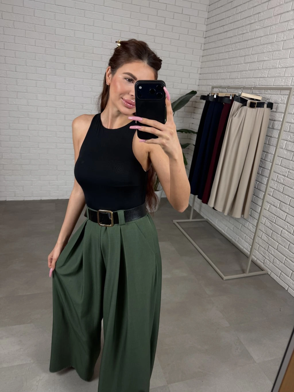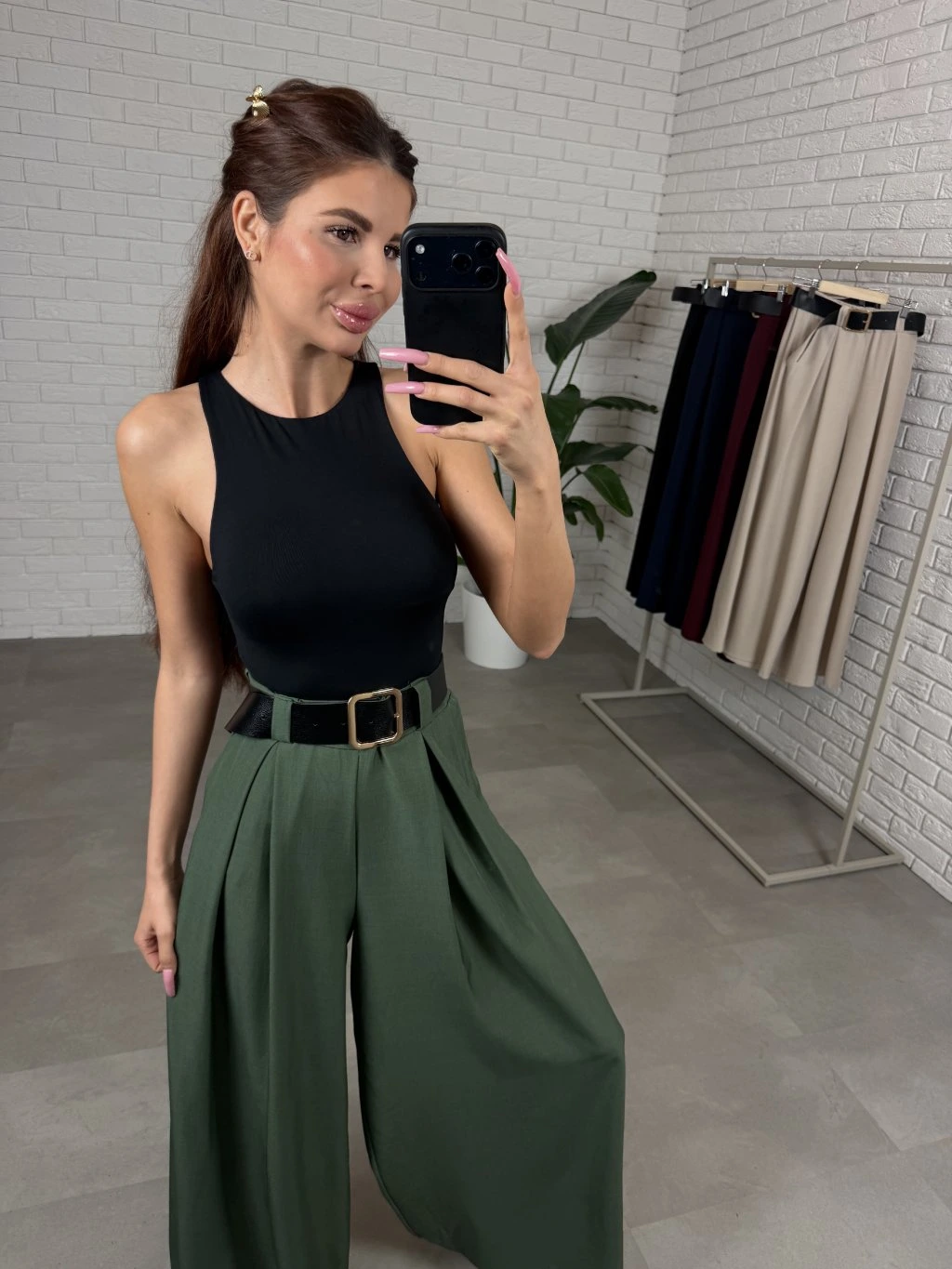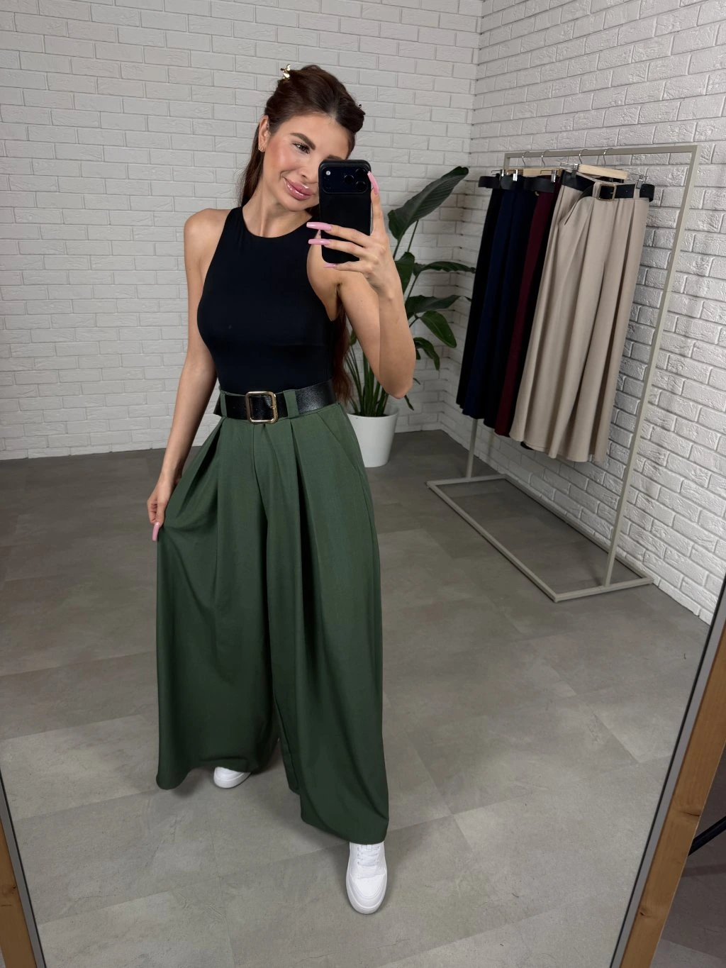 Vysoký pás s voľnou elastickou gumou sa prispôsobí postave a pohodlne sadne aj na väčšie bruško. Súčasťou nohavíc je aj opasok, ktorý zvýrazní pás a dodá celému outfitu elegantný detail. Praktickým prvkom sú tiež vrecká po bokoch.