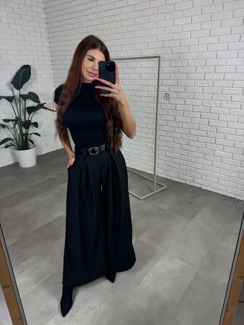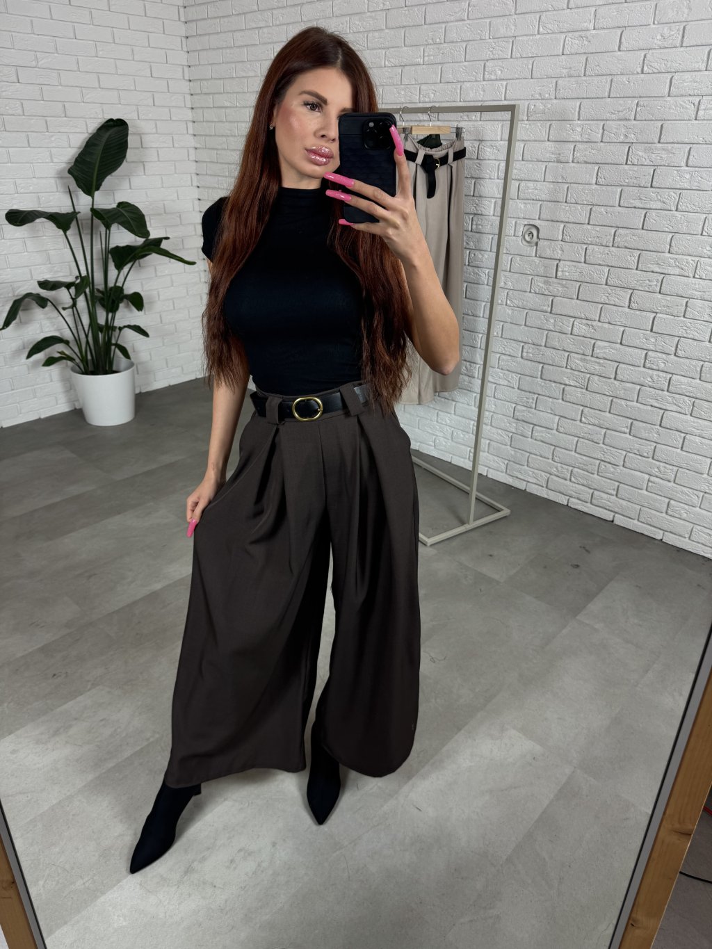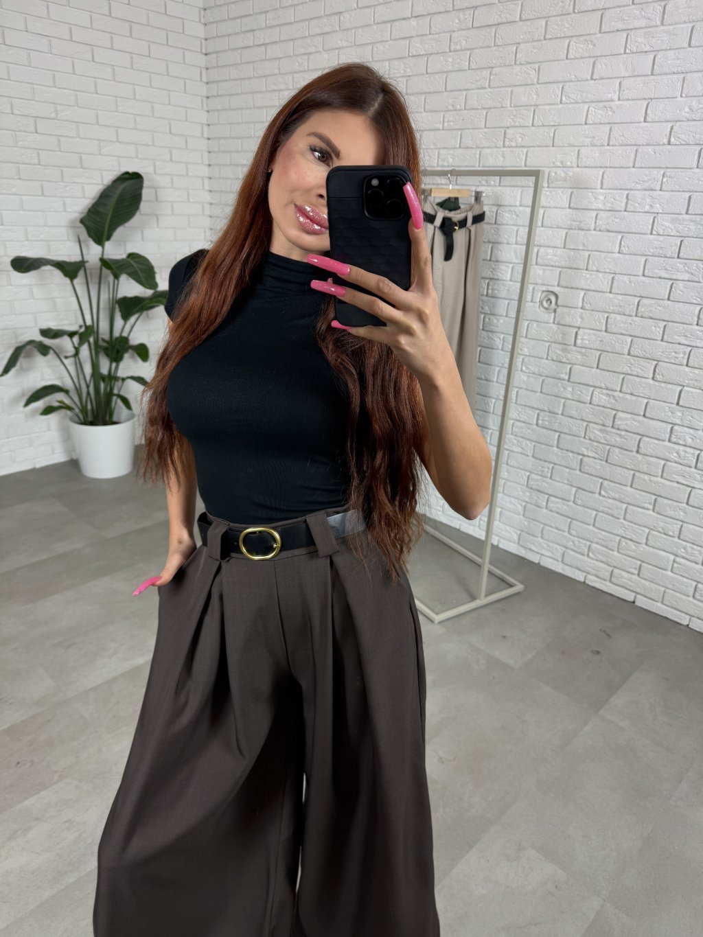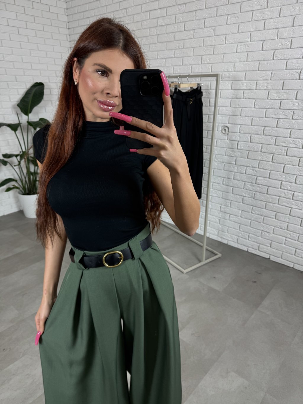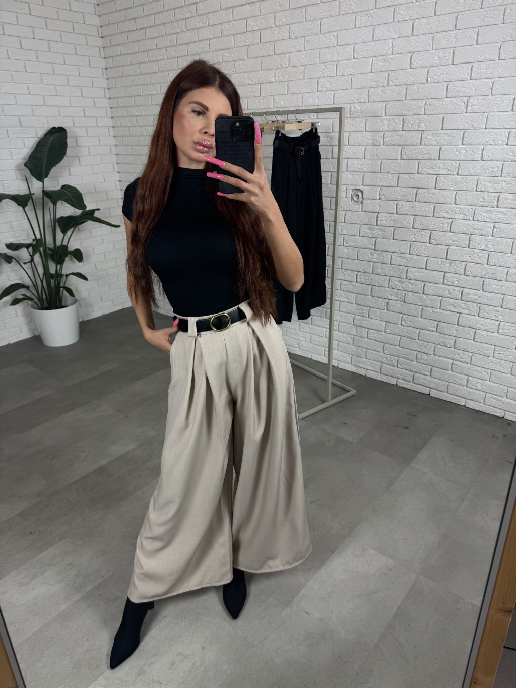 Nohavice ALMONA v rozšírenom strihu. Materiál je hrubší a nekrčivý. Vhodné na jeseň aj na zimu. Vzadu v páse elastická gumka. Po bokoch hlboké vrecká. Opasok je súčasťou nohavíc. Na opasku je zlatá spona. Vpredu majú prekladaný detail. Nohavice sú elastické, takže sadnú od XS po L. Výškovo sadnú od 160cm do 170cm. Modelka na fotke ma 170 cm.