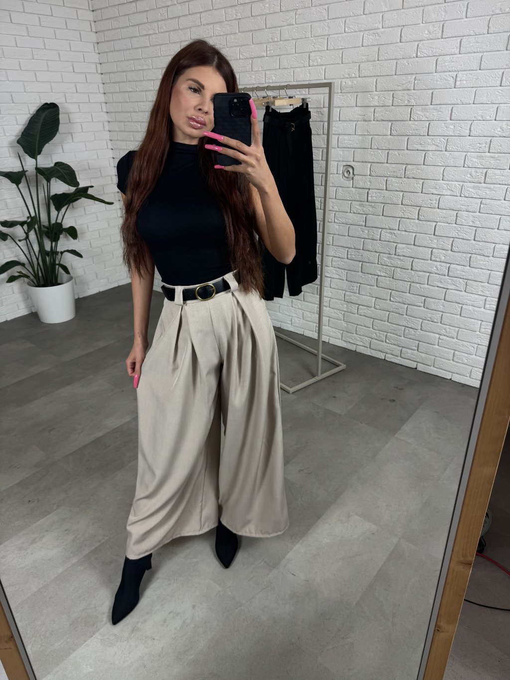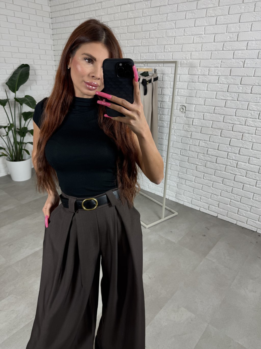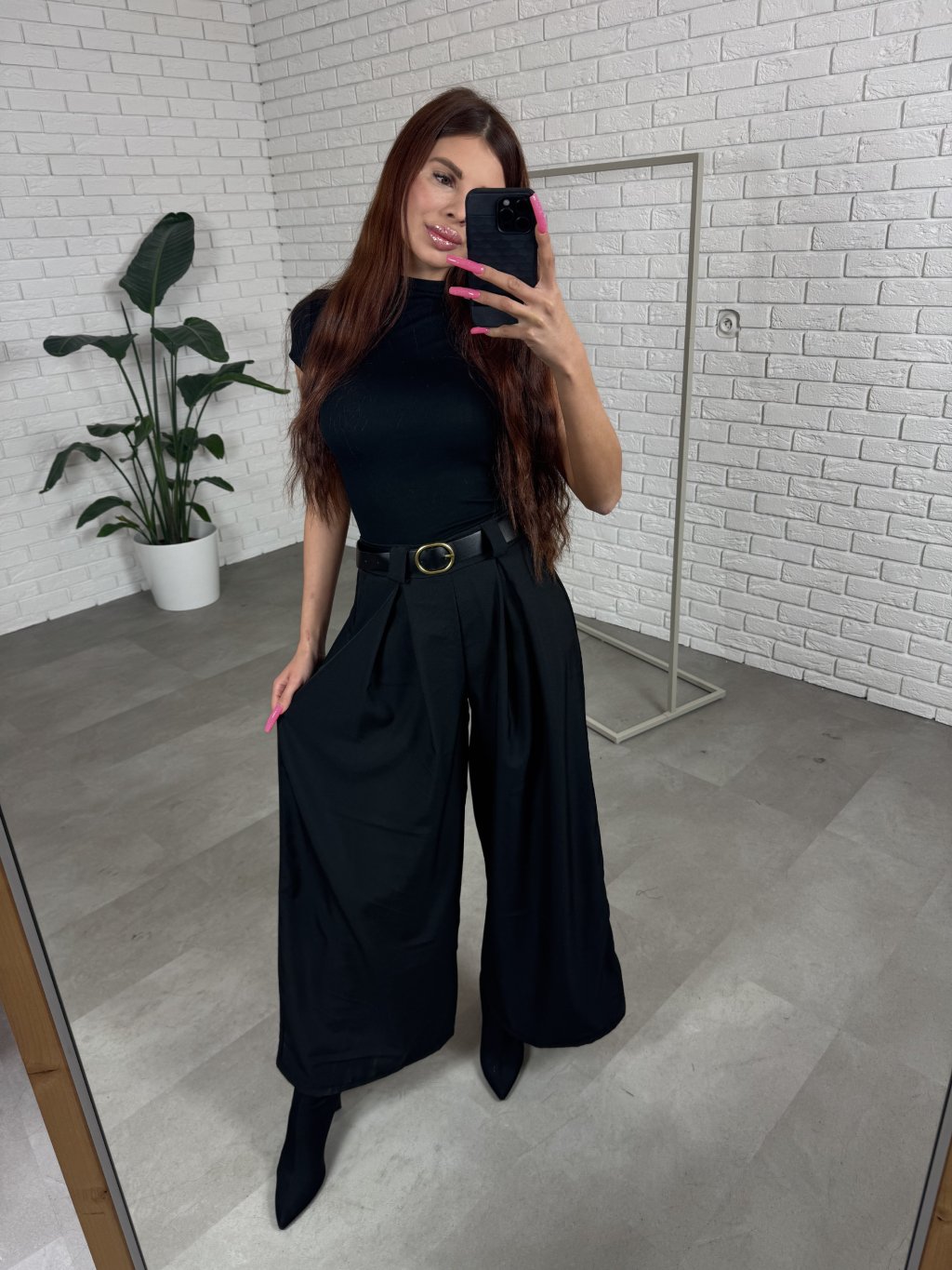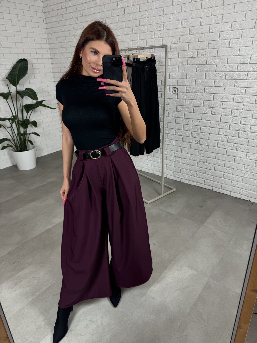 Nohavice ALMONA v rozšírenom strihu. Materiál je hrubší a nekrčivý. Vhodné na jeseň aj na zimu. Vzadu v páse elastická gumka. Po bokoch hlboké vrecká. Opasok je súčasťou nohavíc. Na opasku je zlatá spona. Vpredu majú prekladaný detail. Nohavice sú elastické, takže sadnú od XS po L. Výškovo sadnú od 160cm do 170cm. Modelka na fotke ma 170 cm.