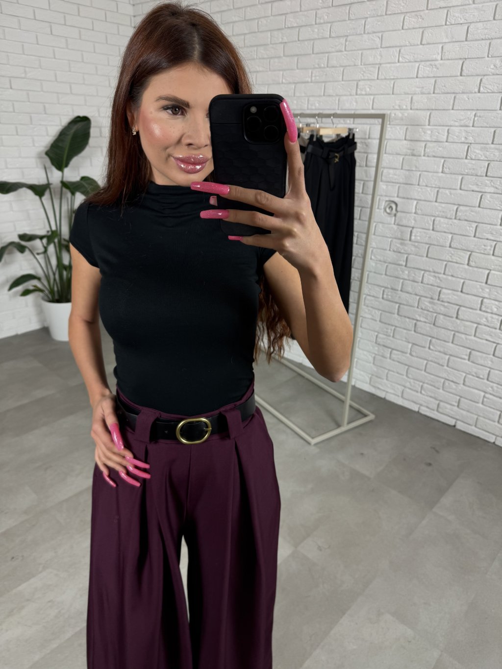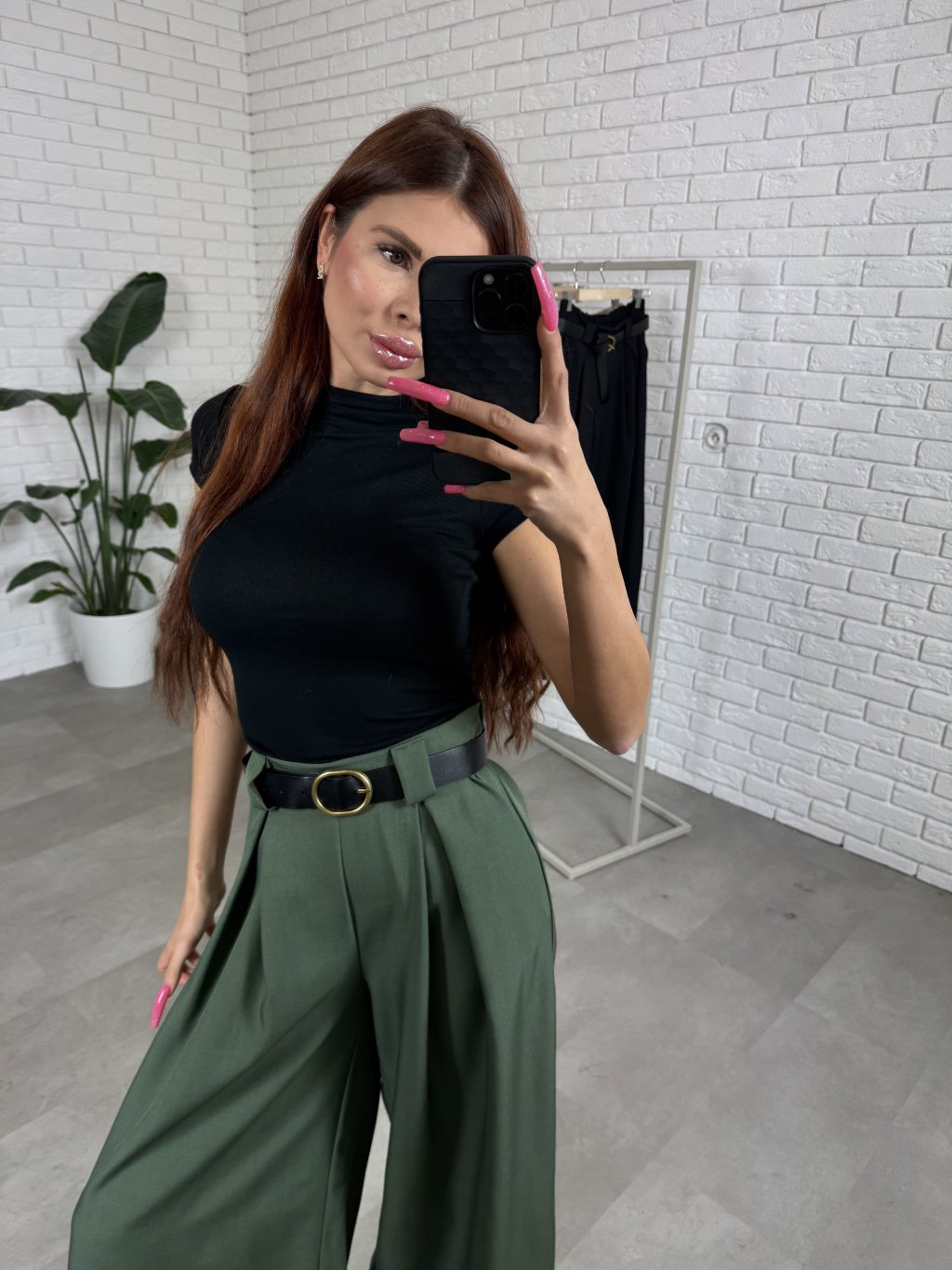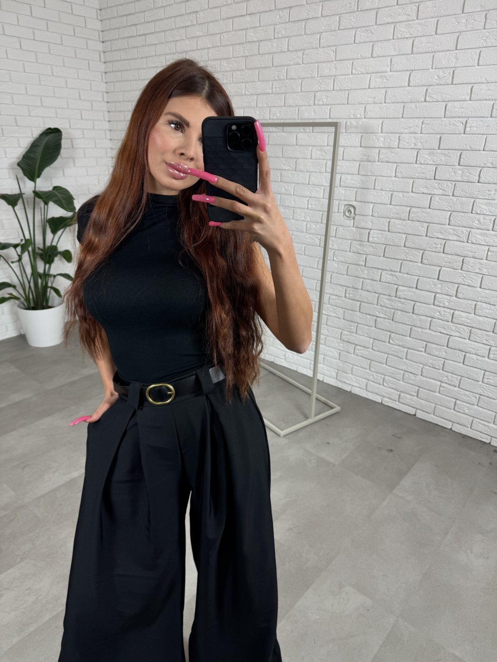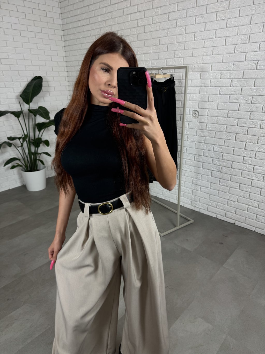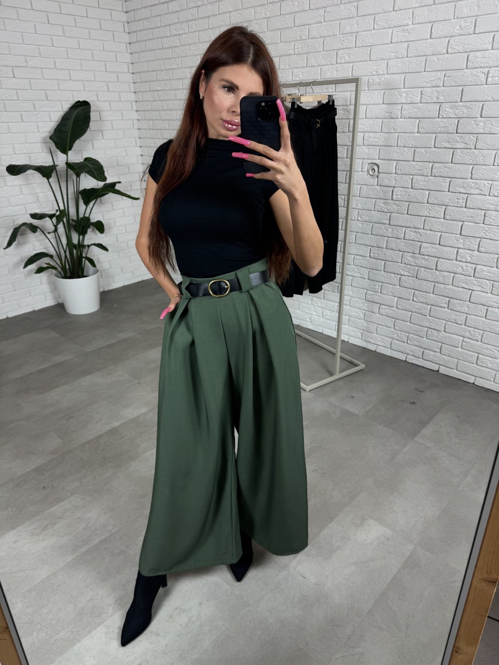 Nohavice ALMONA v rozšírenom strihu. Materiál je hrubší a nekrčivý. Vhodné na jeseň aj na zimu. Vzadu v páse elastická gumka. Po bokoch hlboké vrecká. Opasok je súčasťou nohavíc. Na opasku je zlatá spona. Vpredu majú prekladaný detail. Nohavice sú elastické, takže sadnú od XS po L. Výškovo sadnú od 160cm do 170cm. Modelka na fotke ma 170 cm.