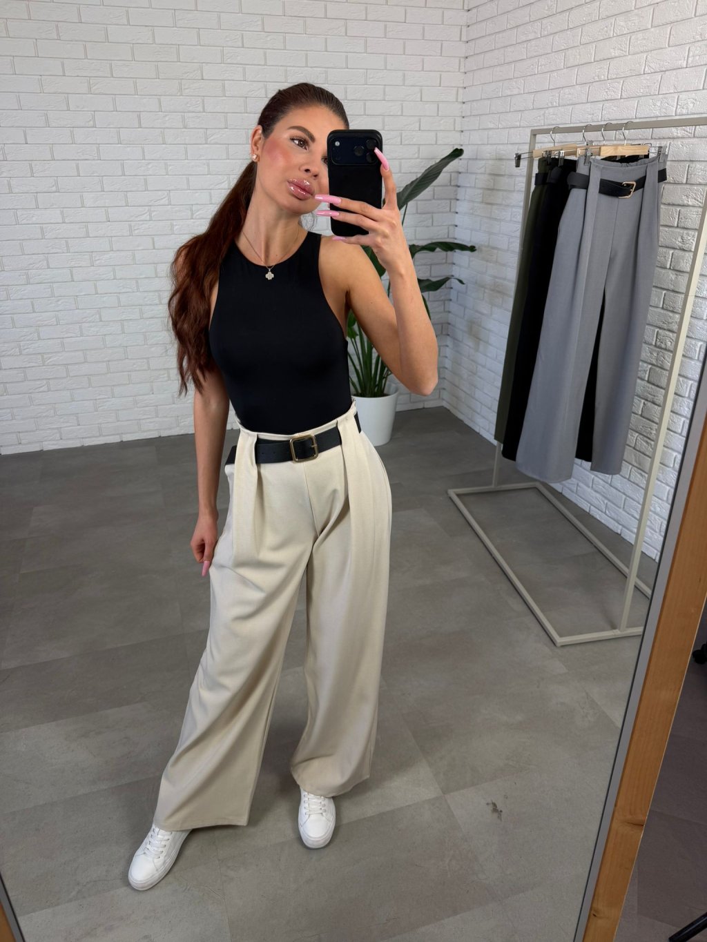 Elegantné nohavice sú navrhnuté tak, aby krásne zvýraznili pás a zároveň vytvorili predĺženú siluetu. Vysoký pás opticky zoštíhľuje postavu a dodáva outfitu upravený a moderný vzhľad, ktorý pôsobí žensky a sebavedomo pri každom kroku. Materiál je kvalitný, nekrčivý a príjemný na dotyk, takže nohavice si zachovávajú svoj elegantný vzhľad počas celého dňa. Voľnejší strih prirodzene splýva na postave, poskytuje pohodlie a zároveň pôsobí veľmi štýlovo. Praktické hlboké vrecká po bokoch dodávajú nohaviciam funkčný detail, ktorý oceníš pri každodennom nosení. Tento model je ideálny na bežné dni, do práce aj na elegantnejšie príležitosti, stačí ich doplniť s body, topom alebo košeľou a vytvoríš nadčasový outfit. Výškovo sú vhodné pre postavy až do 180 cm a veľkostne sadnú od S po L.