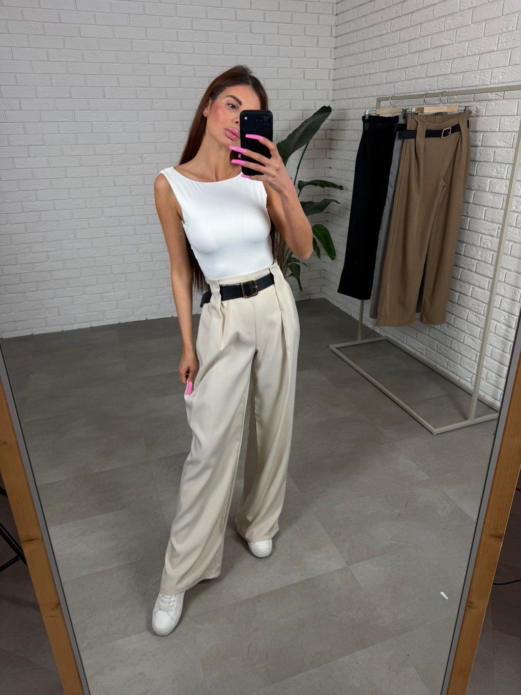 Elegantné nohavice sú navrhnuté tak, aby krásne zvýraznili pás a zároveň vytvorili predĺženú siluetu. Vysoký pás opticky zoštíhľuje postavu a dodáva outfitu upravený a moderný vzhľad, ktorý pôsobí žensky a sebavedomo pri každom kroku. Materiál je kvalitný, nekrčivý a príjemný na dotyk, takže nohavice si zachovávajú svoj elegantný vzhľad počas celého dňa. Voľnejší strih prirodzene splýva na postave, poskytuje pohodlie a zároveň pôsobí veľmi štýlovo. Praktické hlboké vrecká po bokoch dodávajú nohaviciam funkčný detail, ktorý oceníš pri každodennom nosení. Tento model je ideálny na bežné dni, do práce aj na elegantnejšie príležitosti, stačí ich doplniť s body, topom alebo košeľou a vytvoríš nadčasový outfit. Výškovo sú vhodné pre postavy do 180 cm a veľkostne sadnú od S po L.