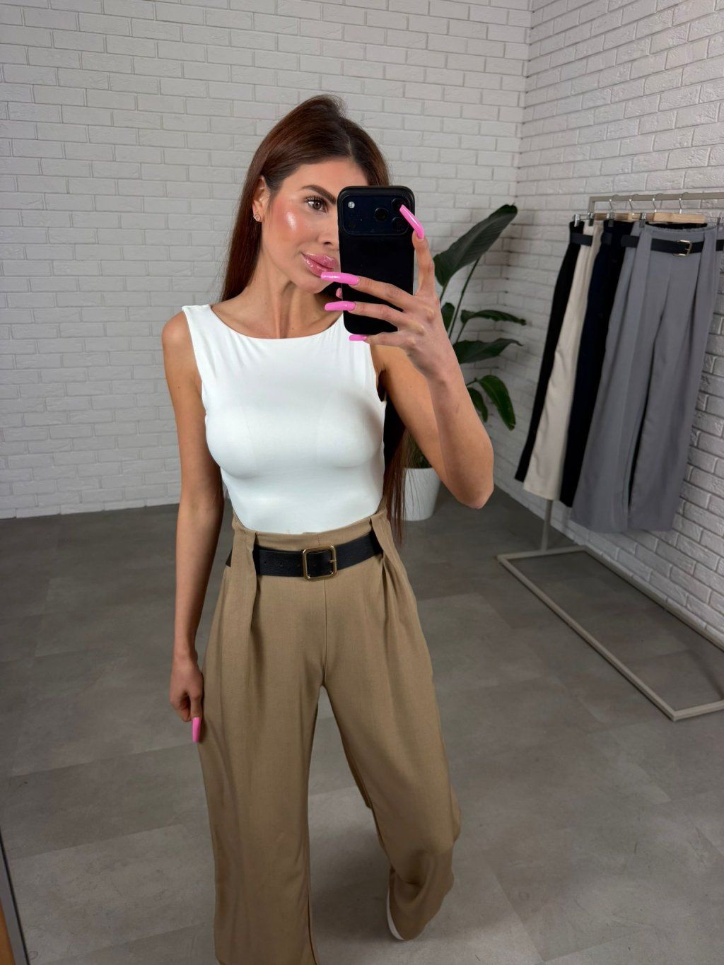 Elegantné nohavice sú navrhnuté tak, aby krásne zvýraznili pás a zároveň vytvorili predĺženú siluetu. Vysoký pás opticky zoštíhľuje postavu a dodáva outfitu upravený a moderný vzhľad, ktorý pôsobí žensky a sebavedomo pri každom kroku. Materiál je kvalitný, nekrčivý a príjemný na dotyk, takže nohavice si zachovávajú svoj elegantný vzhľad počas celého dňa.