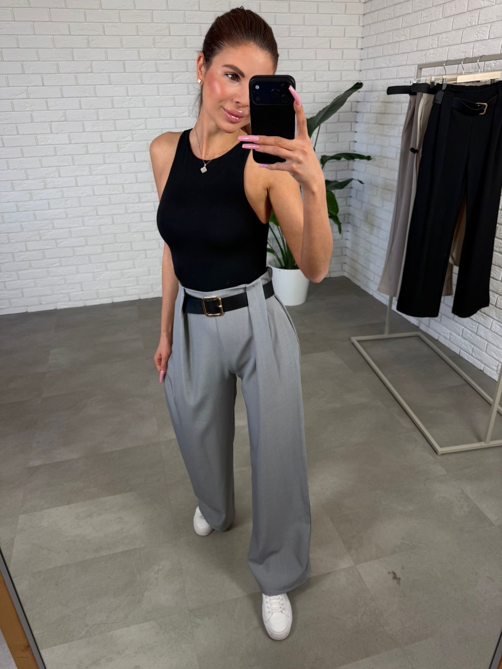 Elegantné nohavice sú navrhnuté tak, aby krásne zvýraznili pás a zároveň vytvorili predĺženú siluetu. Vysoký pás opticky zoštíhľuje postavu a dodáva outfitu upravený a moderný vzhľad, ktorý pôsobí žensky a sebavedomo pri každom kroku. Materiál je kvalitný, nekrčivý a príjemný na dotyk, takže nohavice si zachovávajú svoj elegantný vzhľad počas celého dňa. Voľnejší strih prirodzene splýva na postave, poskytuje pohodlie a zároveň pôsobí veľmi štýlovo. Praktické hlboké vrecká po bokoch dodávajú nohaviciam funkčný detail, ktorý oceníš pri každodennom nosení. Tento model je ideálny na bežné dni, do práce aj na elegantnejšie príležitosti, stačí ich doplniť s body, topom alebo košeľou a vytvoríš nadčasový outfit. Výškovo sú vhodné pre postavy až do 180 cm a veľkostne sadnú od S po L.
