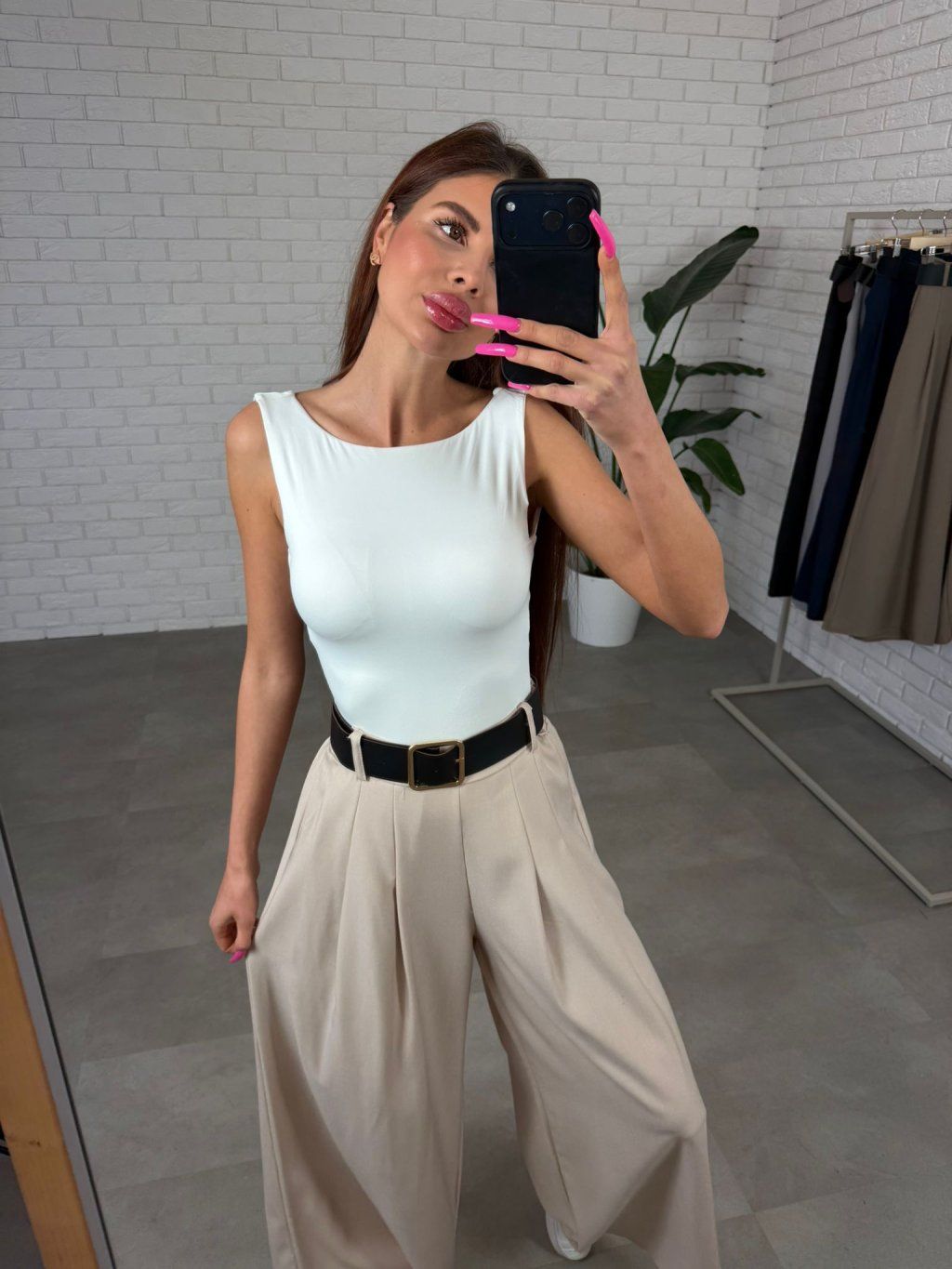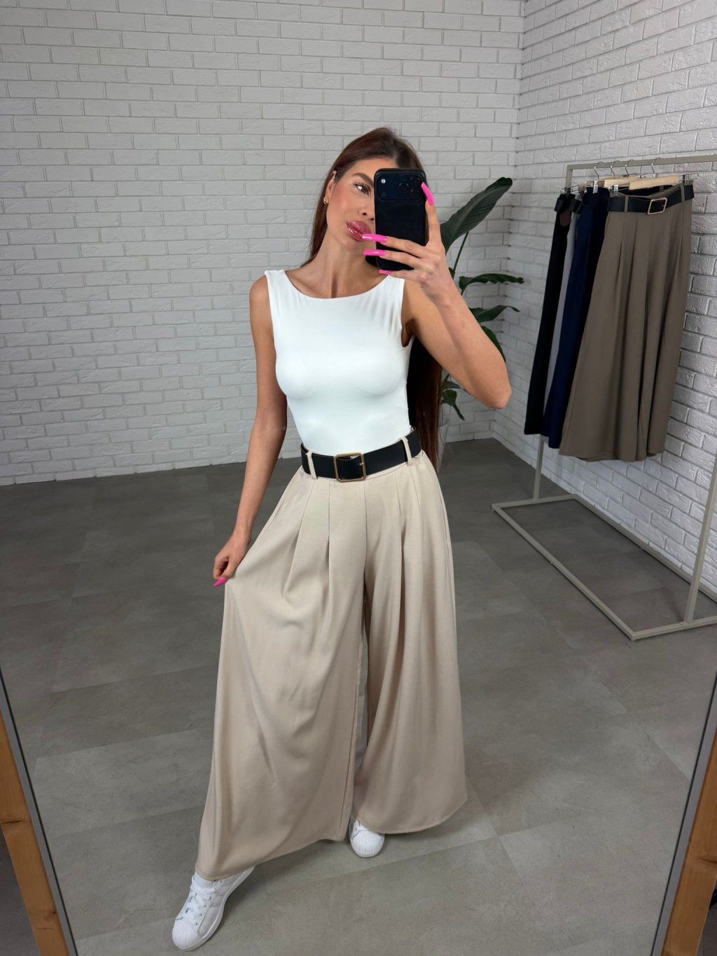 Vysoký pás krásne zvýrazní siluetu a spolu s opaskom vytvorí peknú líniu v páse. Strih je voľný a ležérny, takže nohavice prirodzene splývajú na postave a zakryjú prípadné nedokonalosti v oblasti bruška, bokov alebo zadku. Práve preto sú veľmi obľúbené aj medzi kočkami, ktoré majú výraznejšie ženské krivky. Nohavice sú navrhnuté tak, aby pohodlne sadli aj ženám s väčším zadkom alebo bokmi, pričom stále pôsobia elegantne a žensky. Dĺžkou sú vhodné pre ženy do výšky približne 180 cm a veľkostne sadnú od S po XL.