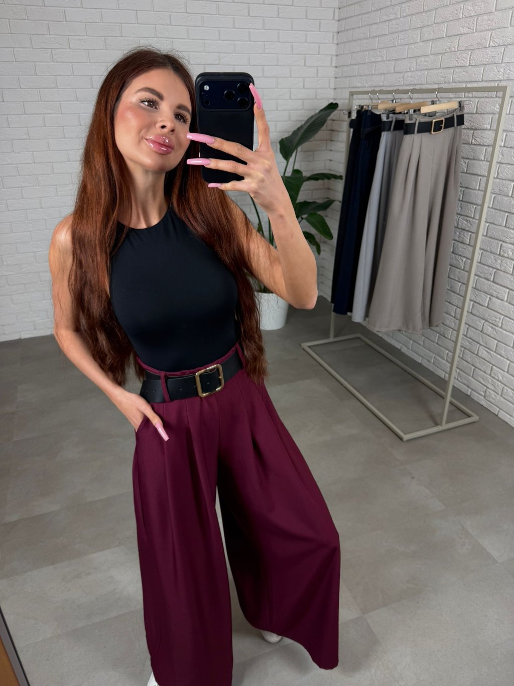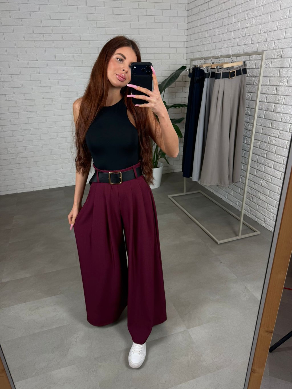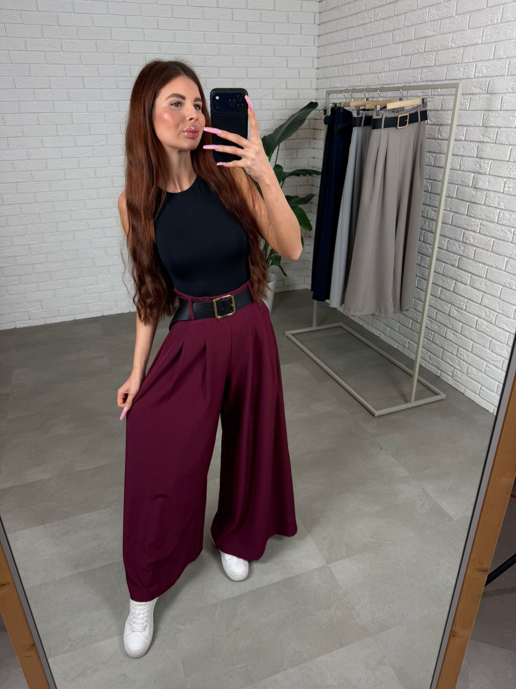 Vysoký pás krásne zvýrazní siluetu a spolu s opaskom vytvorí peknú líniu v páse. Strih je voľný a ležérny, takže nohavice prirodzene splývajú na postave a zakryjú prípadné nedokonalosti v oblasti bruška, bokov alebo zadku. Práve preto sú veľmi obľúbené aj medzi kočkami, ktoré majú výraznejšie ženské krivky. Nohavice sú navrhnuté tak, aby pohodlne sadli aj ženám s väčším zadkom alebo bokmi, pričom stále pôsobia elegantne a žensky. Dĺžkou sú vhodné pre ženy do výšky približne 180 cm a veľkostne sadnú od S po XL.