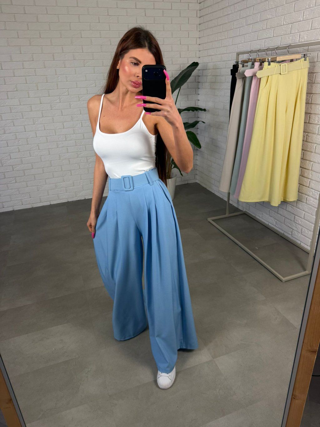 Vysoký pás spolu s opaskom v rovnakom materiáli a farbe vytvára peknú líniu v páse a umožňuje prispôsobiť nohavice presne podľa postavy. Po bokoch sa nachádzajú praktické vrecká, ktoré oceníš pri bežnom nosení.