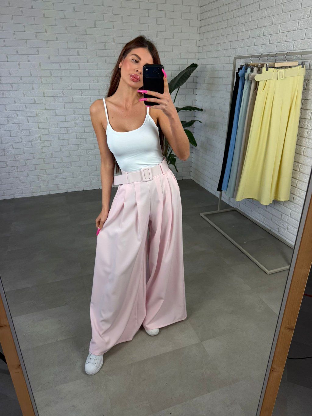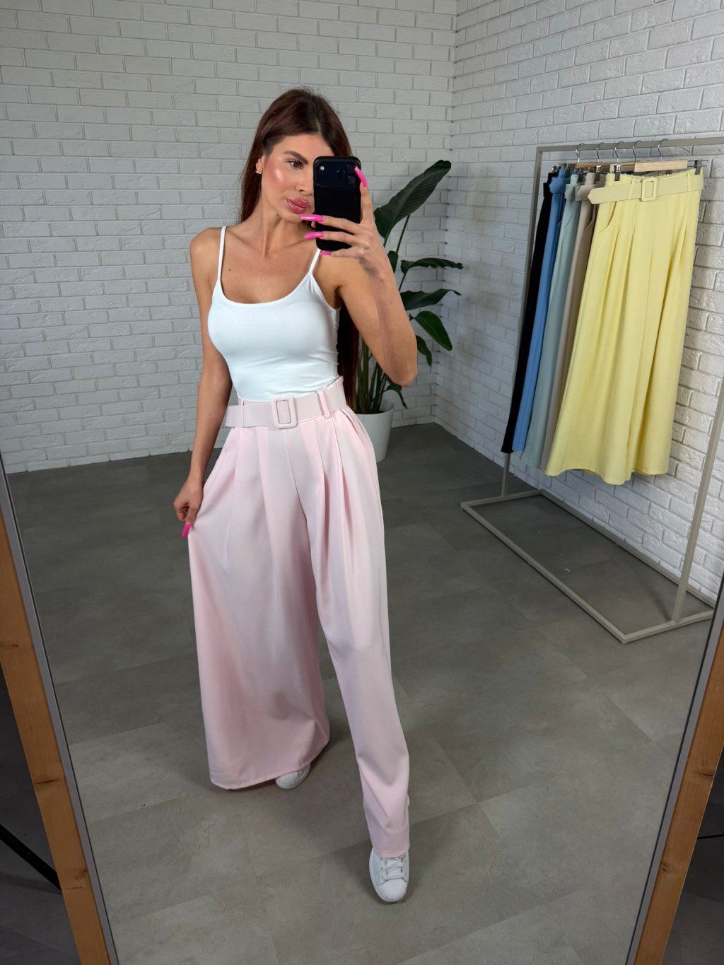 Vysoký pás spolu s opaskom v rovnakom materiáli a farbe vytvára peknú líniu v páse a umožňuje prispôsobiť nohavice presne podľa postavy. Po bokoch sa nachádzajú praktické vrecká, ktoré oceníš pri bežnom nosení.