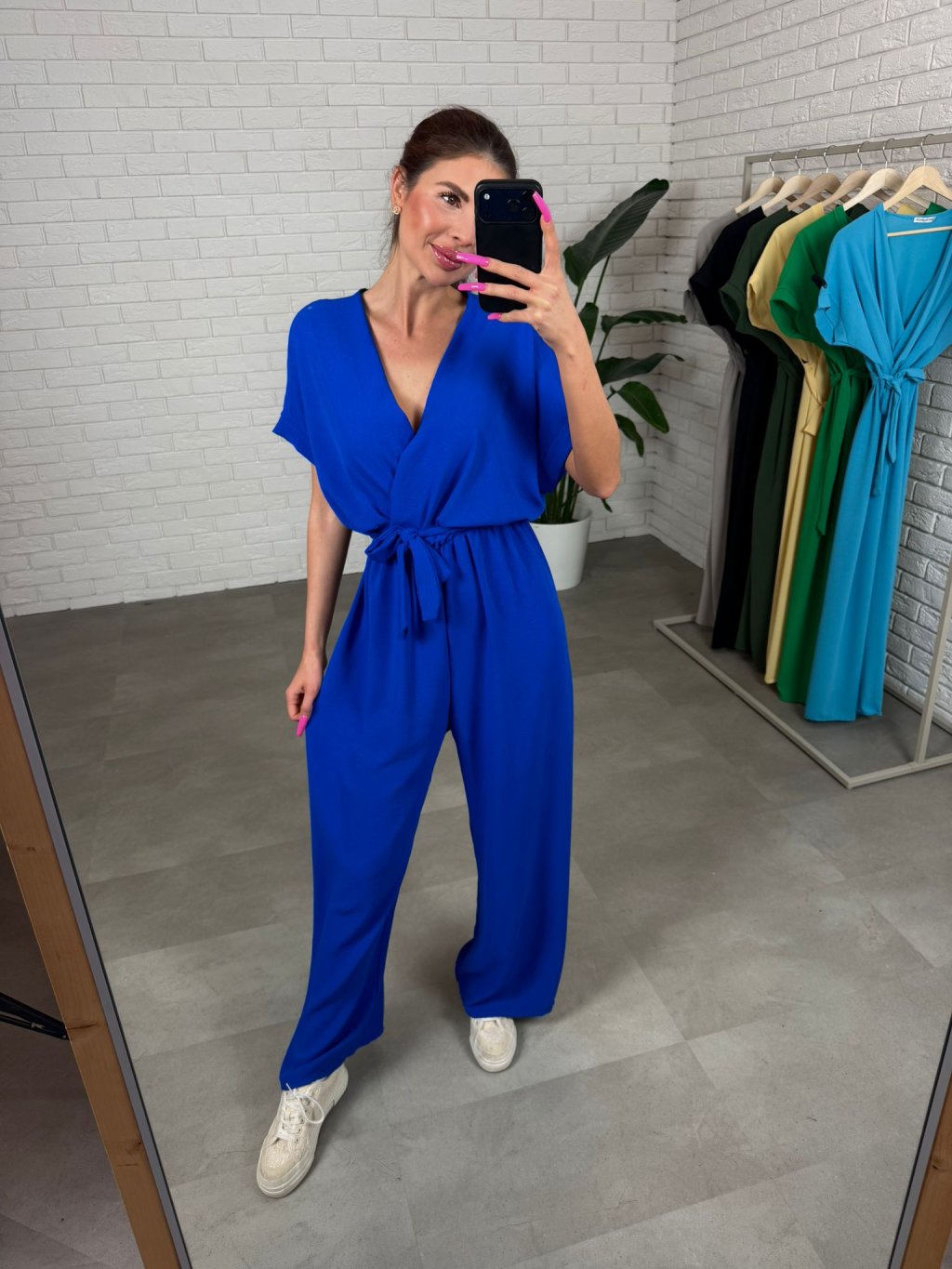 Prekladaný dekolt sa krásne prispôsobí rôznym typom postavy, takže sadne aj na menšie aj väčšie prsia a vytvorí peknú líniu v hornej časti tela. Elastický pás spolu s mašličkou umožní prispôsobiť overal presne podľa seba a jemne zvýrazniť pás.