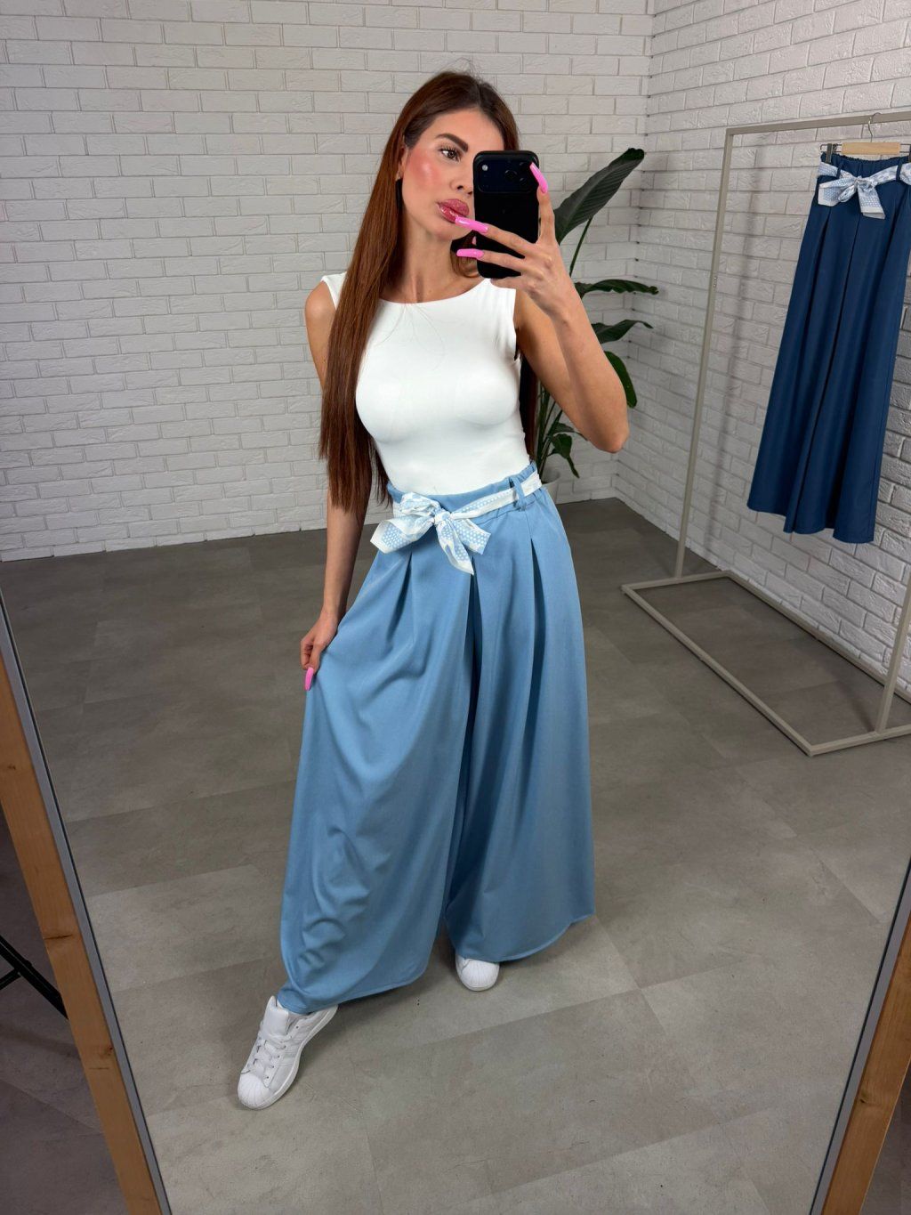 Šatka v páse nahrádza klasický opasok a dodáva nohaviciam jemný, ženský detail, ktorý si vieš uviazať podľa seba.