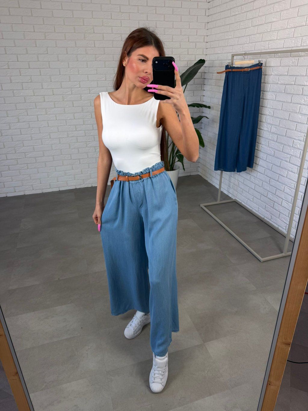 Strih je pohodlný a ležérny, poskytuje dostatok miesta v oblasti bruška, bokov aj zadočku, takže sa v nich cítiš prirodzene a komfortne. Opasok je súčasťou nohavíc a spolu s detailom falošného zipsu dotvára upravený, športovo-elegantný vzhľad.