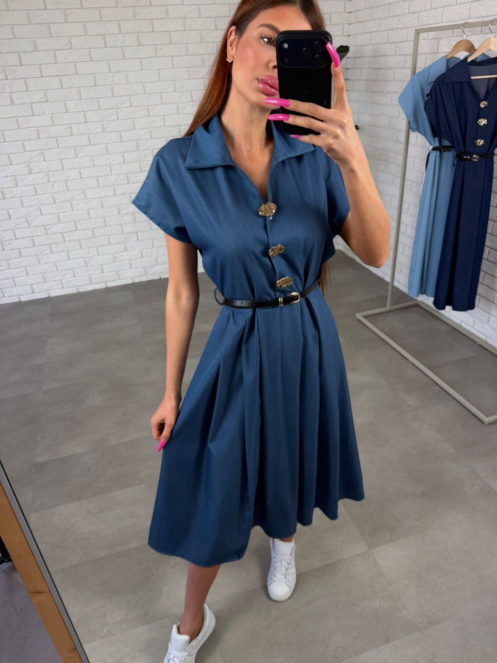 Vrchná časť je doplnená košeľovým limčekom, ktorý dodáva šatám upravený vzhľad. Rukávy sú voľnejšie, aby sa pohodlne prispôsobili každému obvodu ruky a nepôsobili tesne.