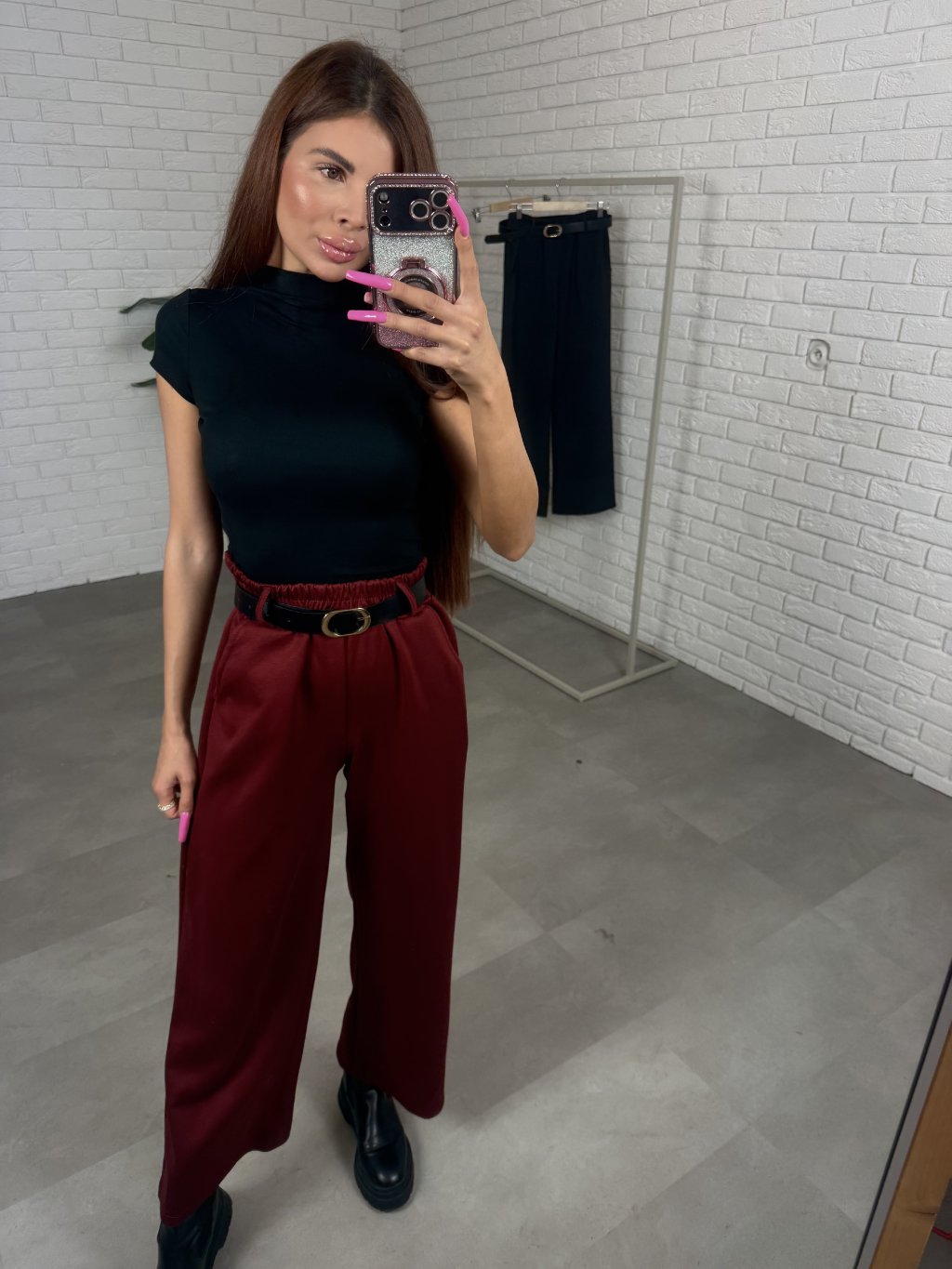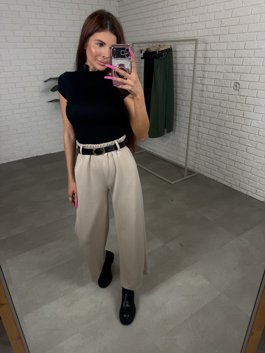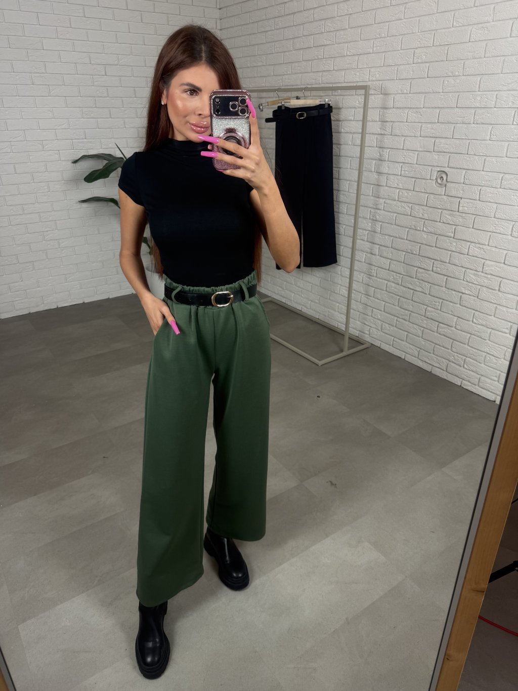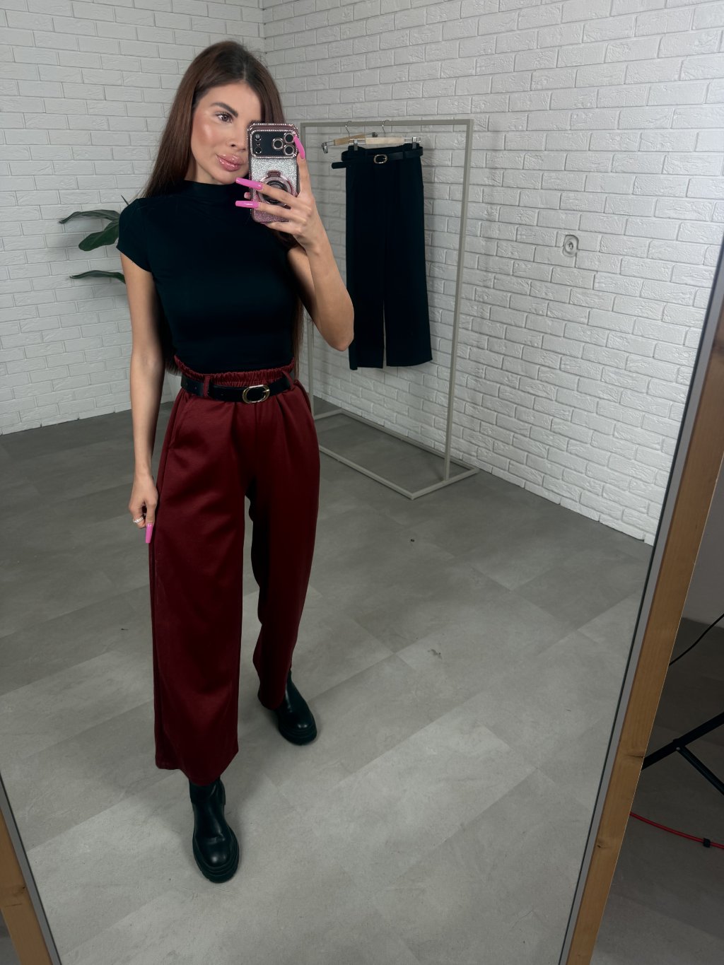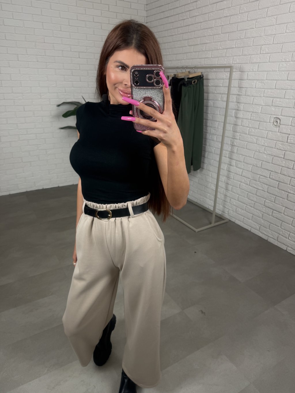 Poloteplákové nohavice BOREN sú skvelou voľbou na športový aj elegantný štýl. Súčasťou nohavíc je opasok so zlatou sponou. Majú vysoký, elastický pás a praktické vrecká po bokoch. Vyrobené sú z príjemného poloteplákového materiálu. Dĺžka je vhodná pre postavu do výšky 175 cm. Modelka na fotografii má 170 cm. Veľkostne sedia od XS po XL.