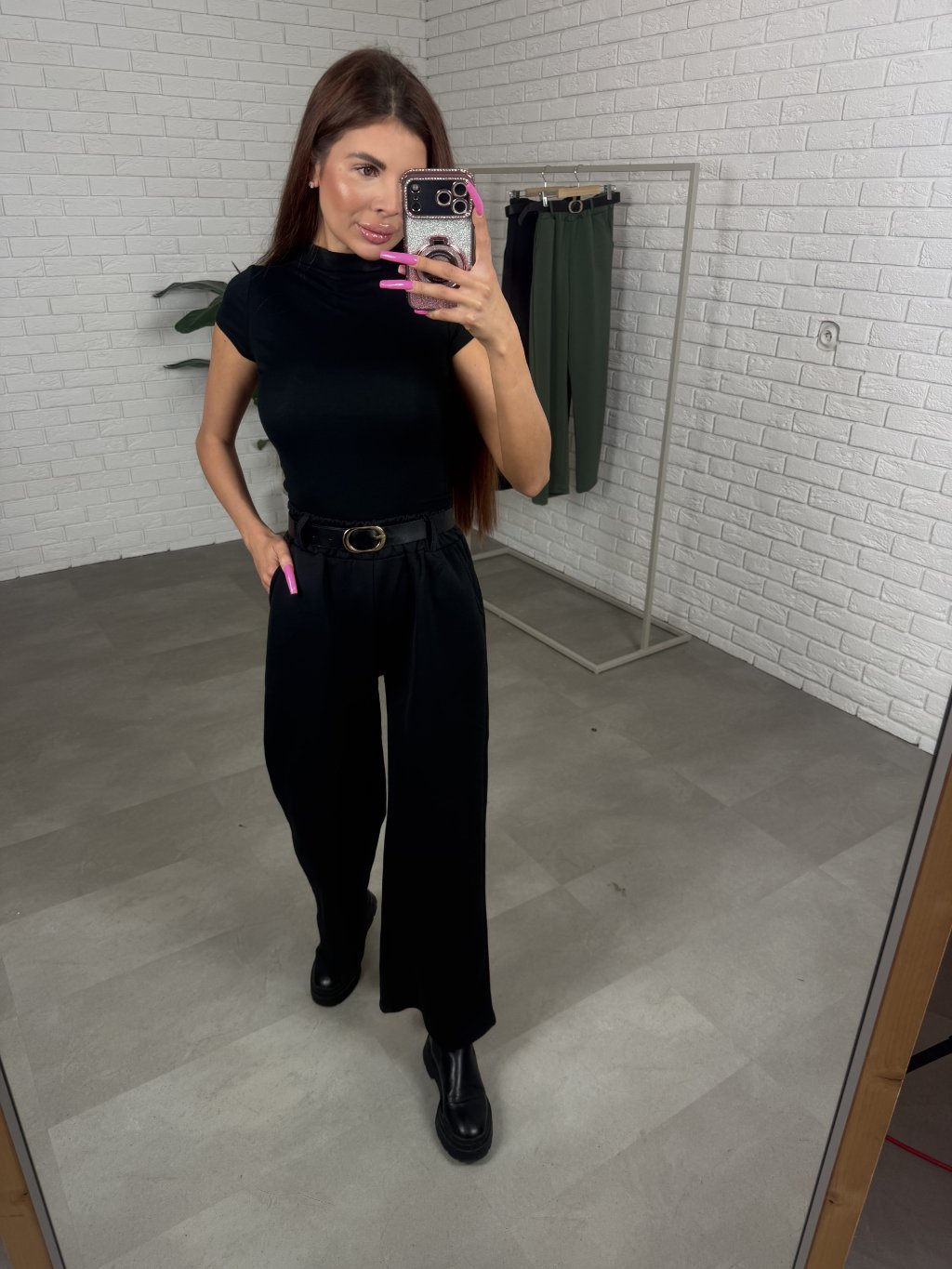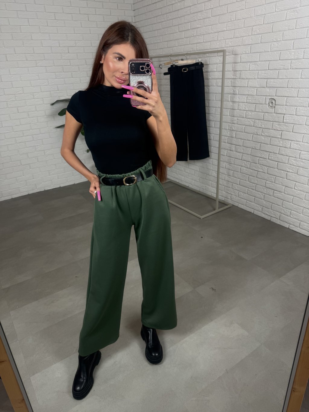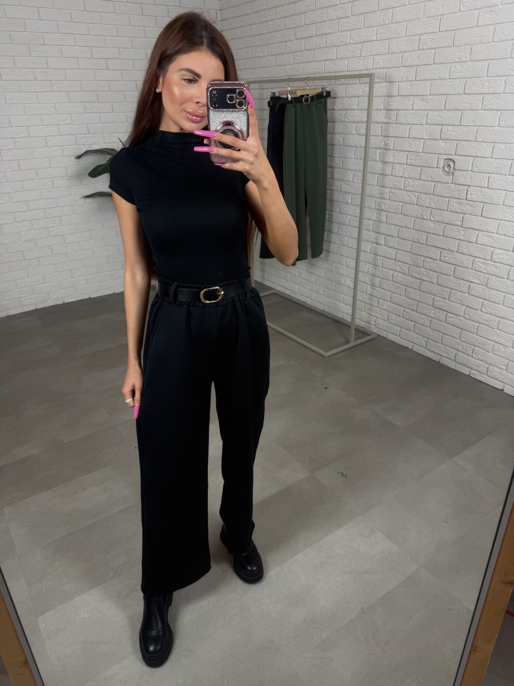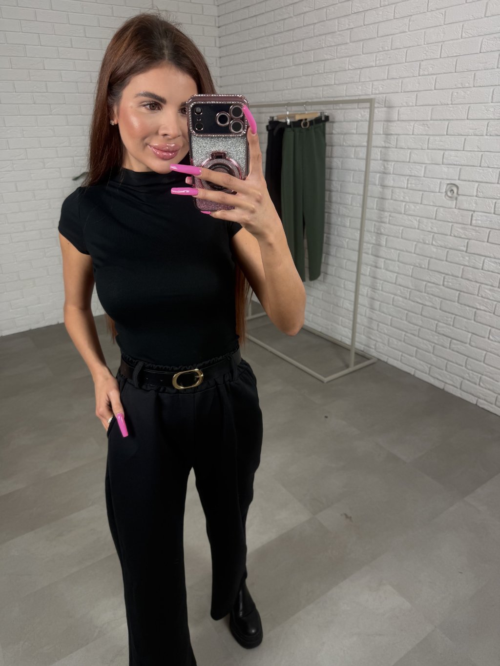 Poloteplákové nohavice BOREN sú skvelou voľbou na športový aj elegantný štýl. Súčasťou nohavíc je opasok so zlatou sponou. Majú vysoký, elastický pás a praktické vrecká po bokoch. Vyrobené sú z príjemného poloteplákového materiálu. Dĺžka je vhodná pre postavu do výšky 175 cm. Modelka na fotografii má 170 cm. Veľkostne sedia od XS po XL.
