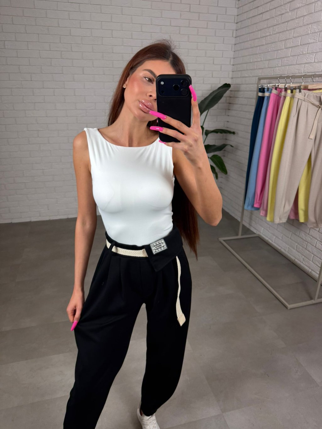 Materiál je príjemný, mäkký a poddajný, takže sa krásne prispôsobí postave bez nepríjemného obmedzenia. Vysoký pás poskytuje dostatok priestoru a komfortu aj pre väčšie bruško, pričom opasok pomáha doladiť pás a celkový vzhľad nohavíc.