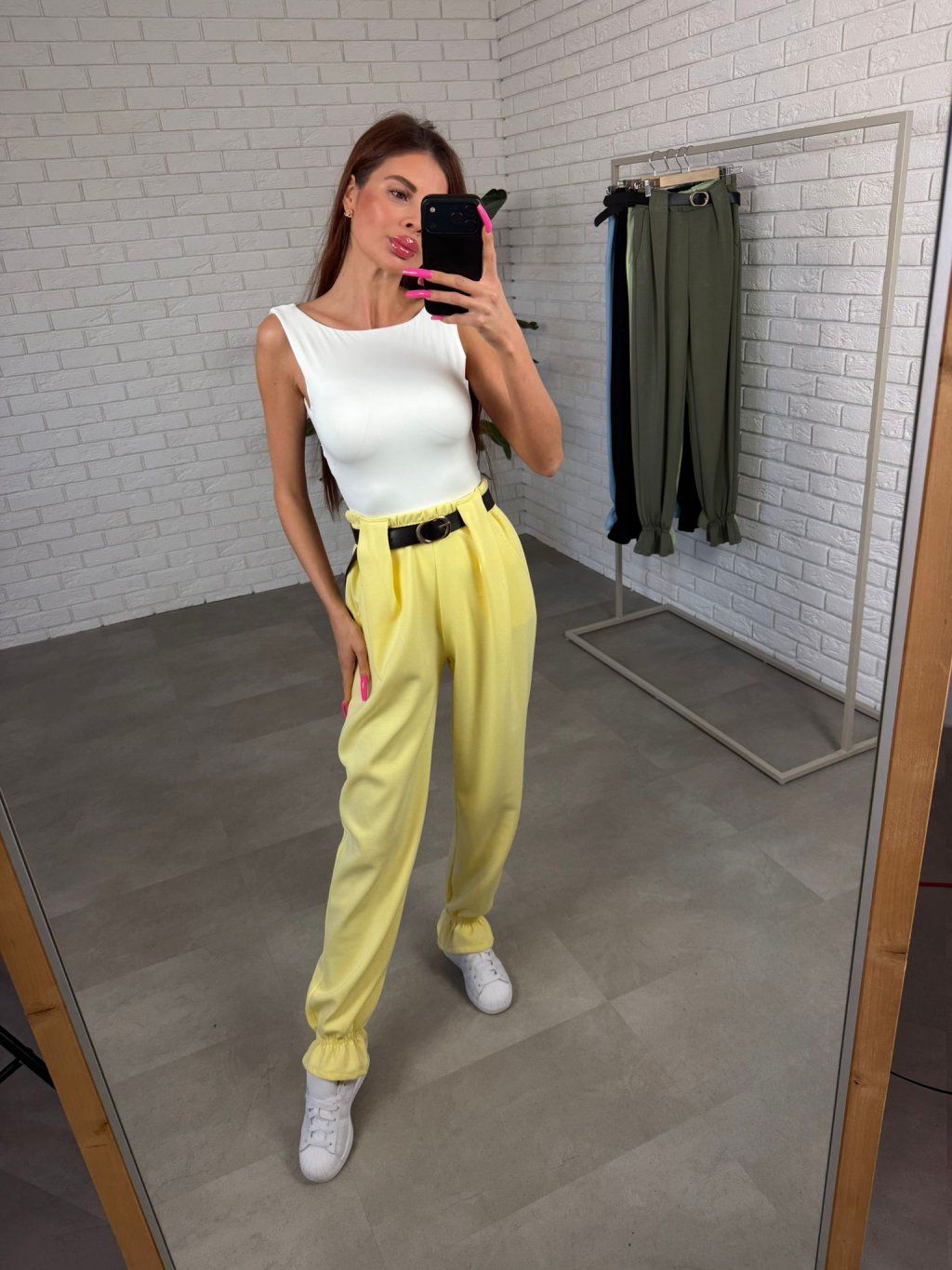 Poloteplákový materiál je mäkký, príjemný na dotyk a drží si tvar, takže nohavice pôsobia upravene aj pri bežnom nosení. Vysoký pás spolu s opaskom zvýrazní siluetu a vytvorí peknú líniu v páse.