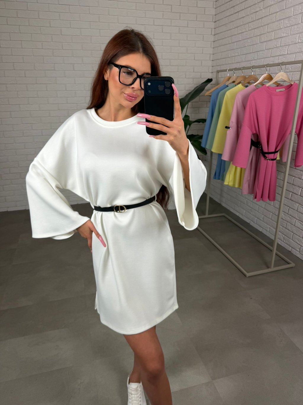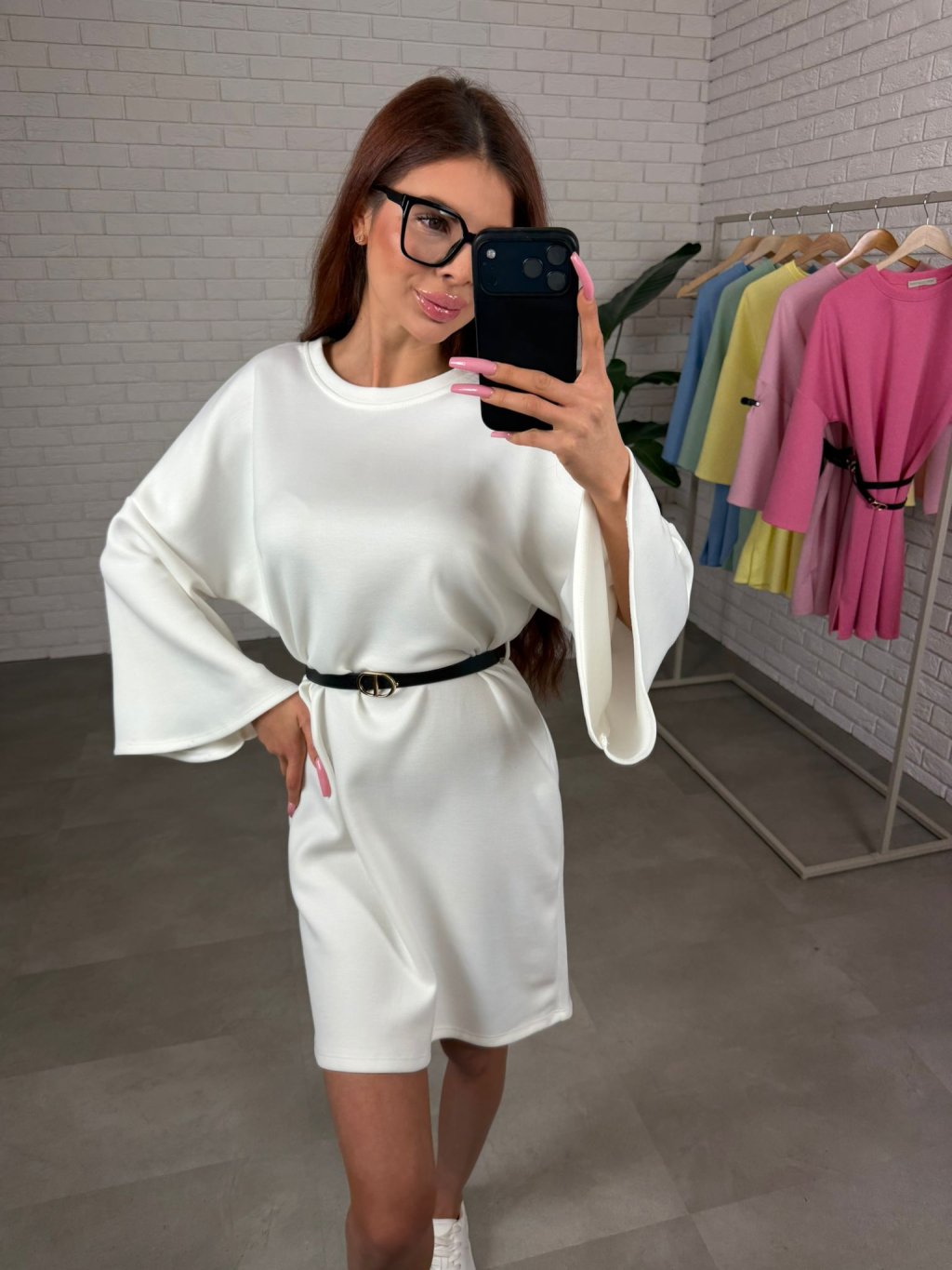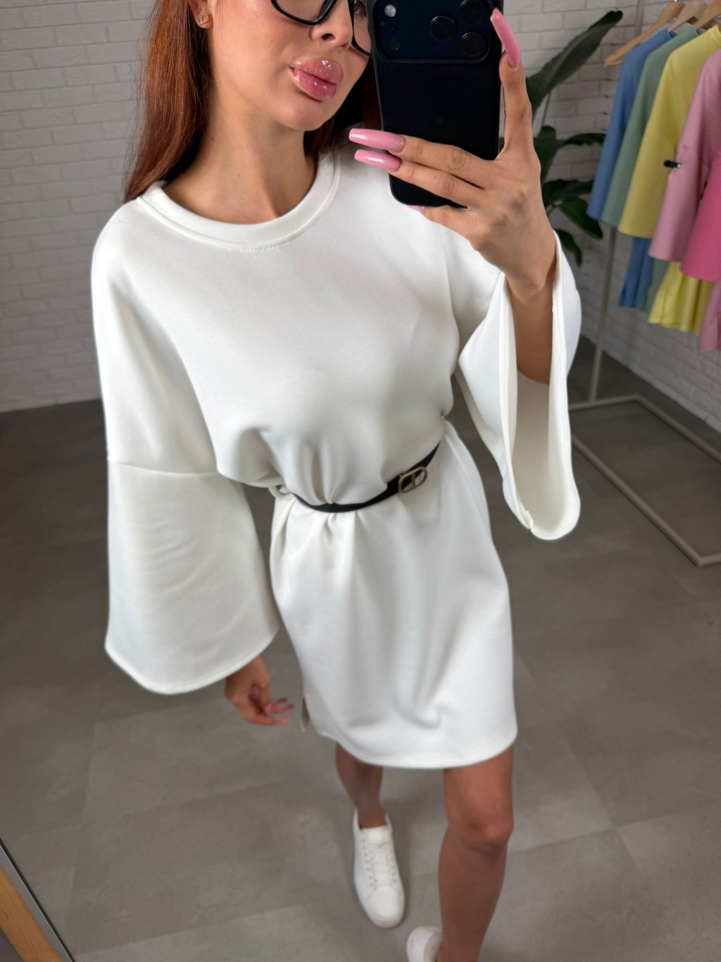 Dlhé rozšírené rukávy sú navrhnuté tak, aby sa prispôsobili každému obvodu ruky a zároveň dodávajú šatám jemne elegantný vzhľad. Súčasťou je opasok, ktorým si môžeš zvýrazniť pás a vytvoriť krajšiu siluetu, alebo šaty nosiť voľne pre pohodlnejší ležérny štýl.