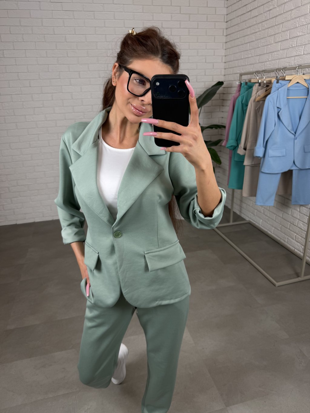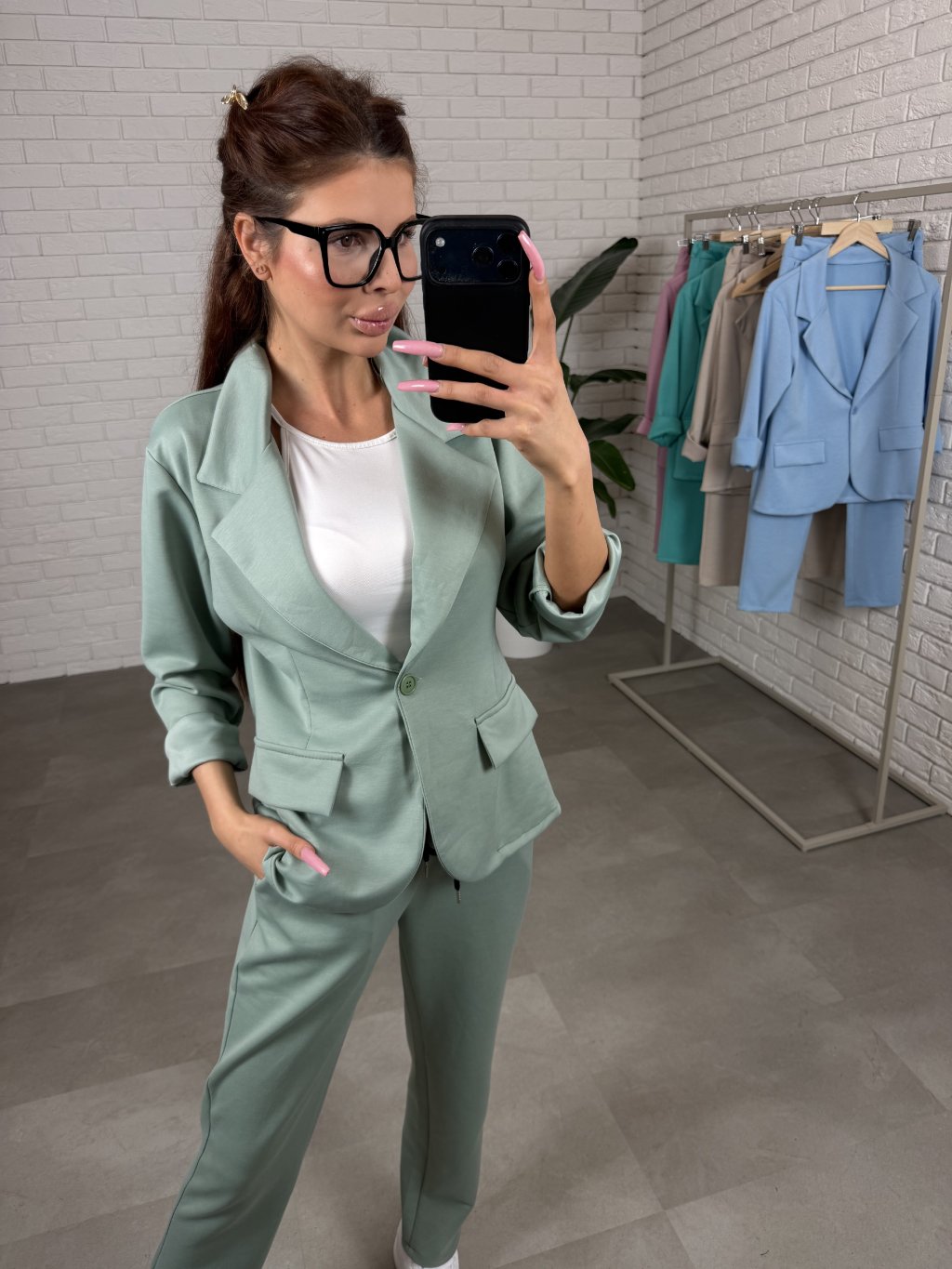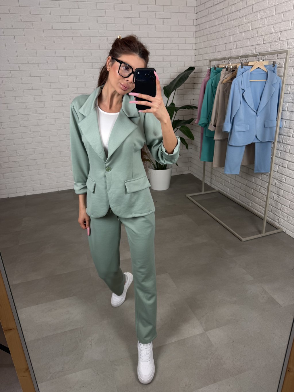 Nohavice majú po bokoch praktické vrecká a pohodlný strih, ktorý sa príjemne nosí počas celého dňa. Sako dodáva celému kompletu upravenejší charakter a je doplnené o jemné falošné vrecká, ktoré vytvárajú elegantný detail.