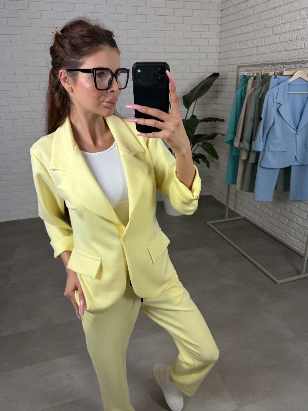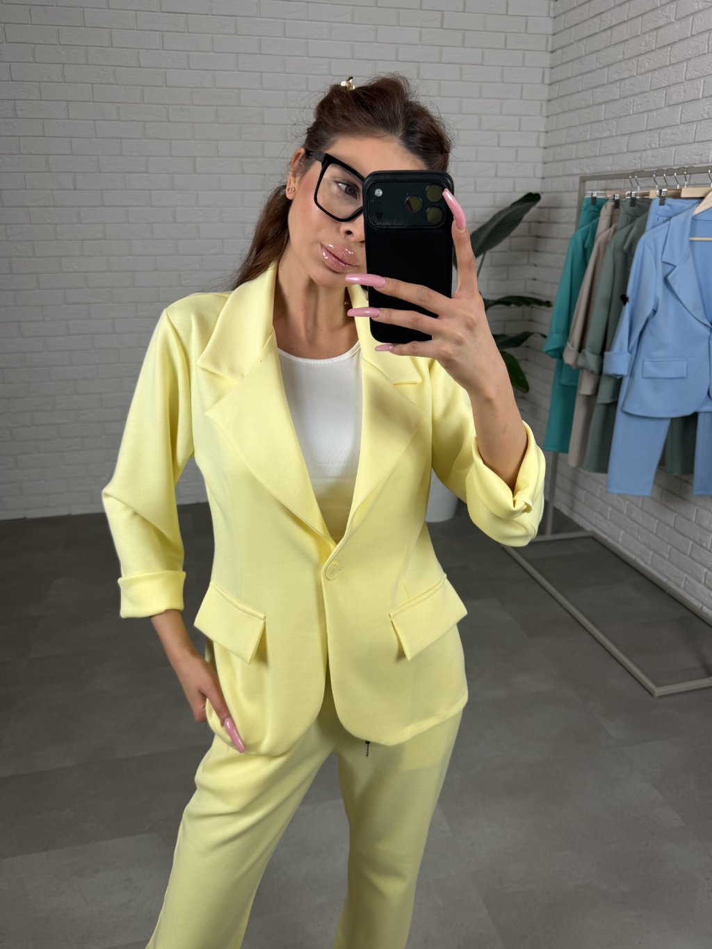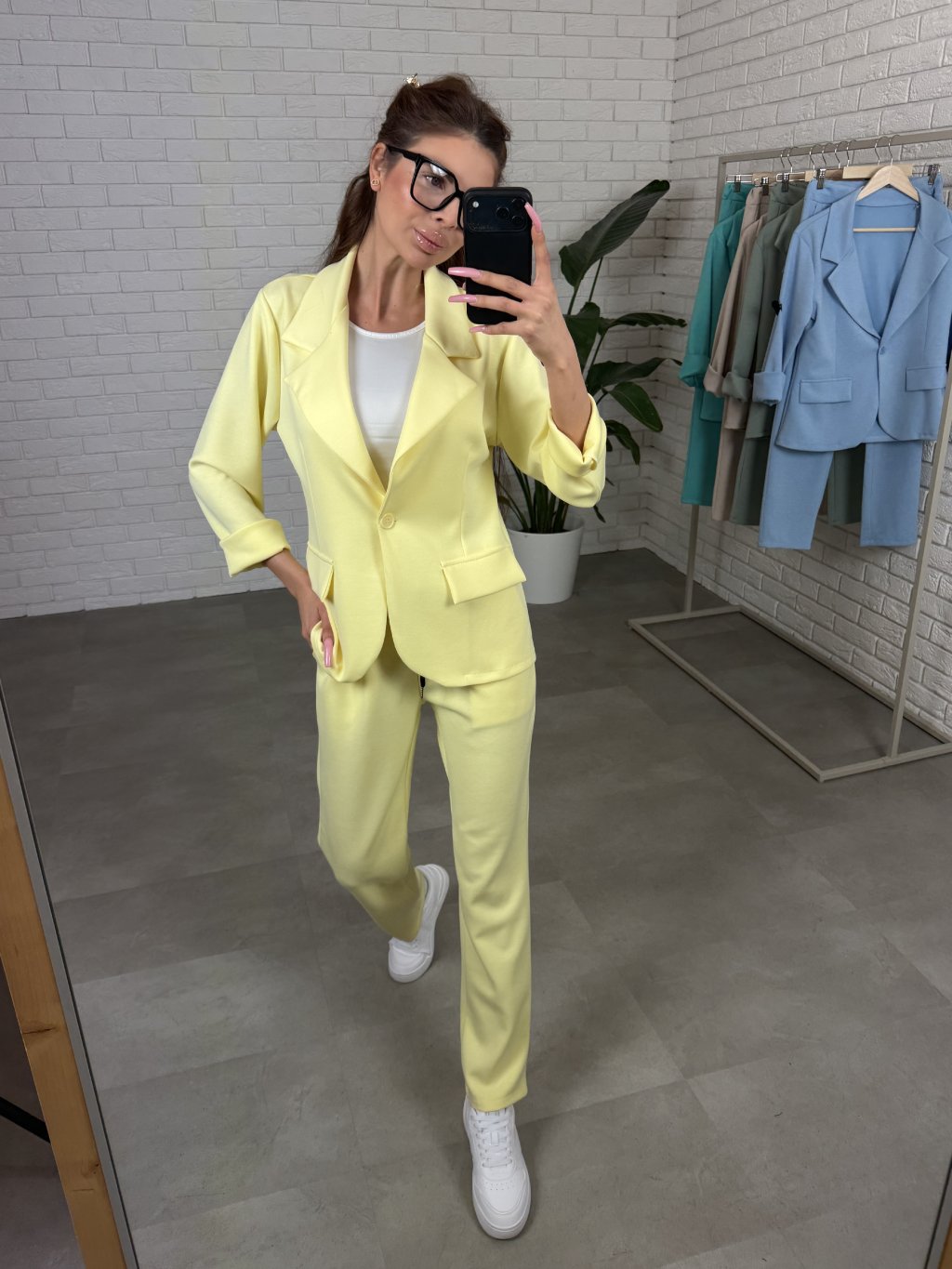 Nohavice majú po bokoch praktické vrecká a pohodlný strih, ktorý sa príjemne nosí počas celého dňa. Sako dodáva celému kompletu upravenejší charakter a je doplnené o jemné falošné vrecká, ktoré vytvárajú elegantný detail.
