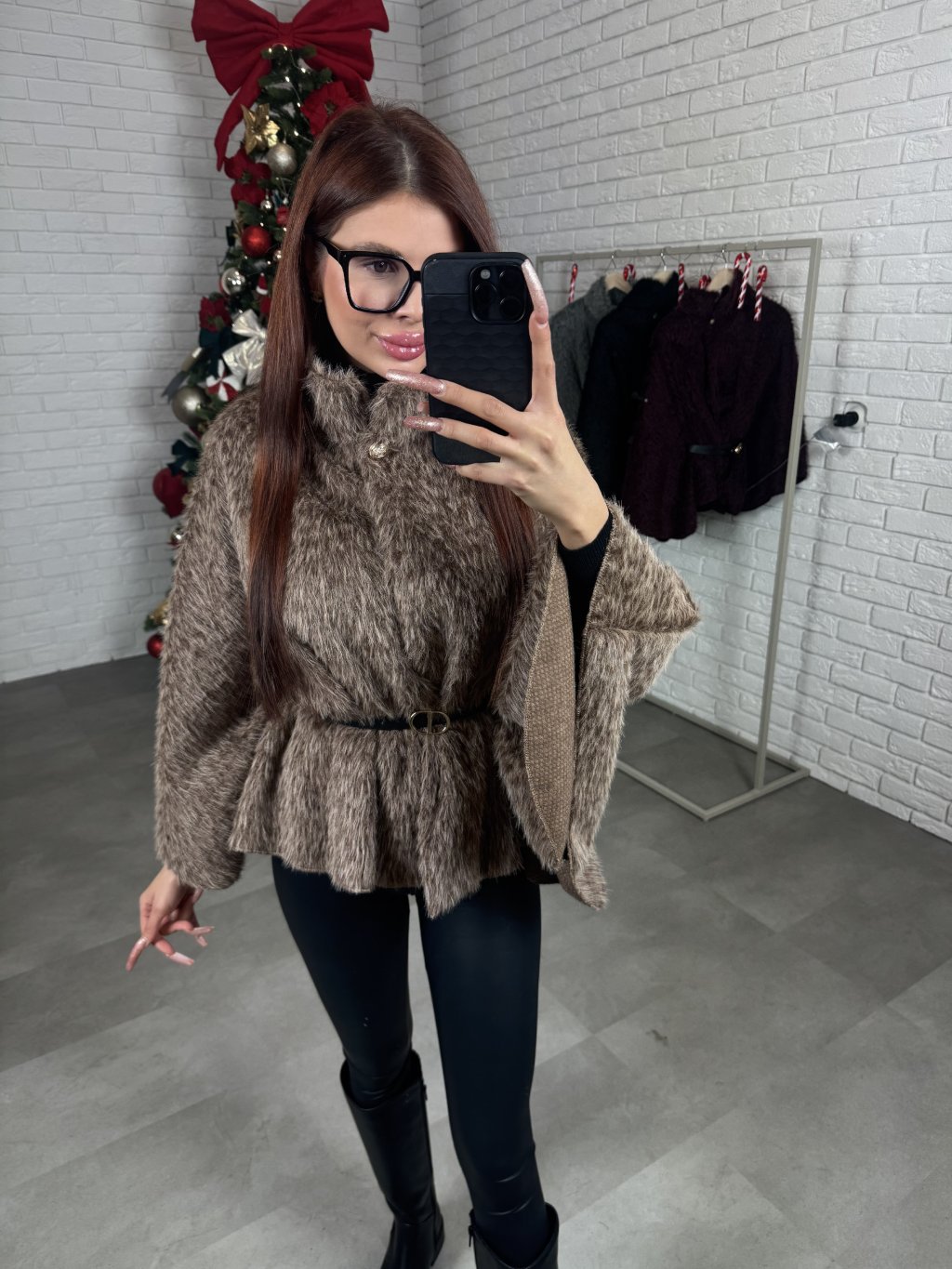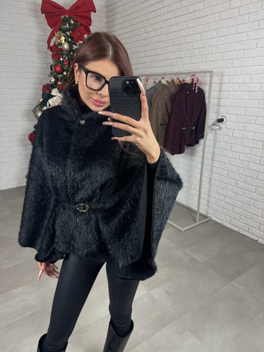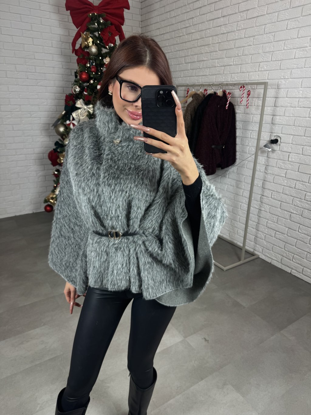 Pončo OLINKA vás počas zimy spoľahlivo zahreje a pohodlne nahradí aj kožúšok. Je vyrobené z príjemného, „chlpatého“ materiálu, ktorý pôsobí luxusne a hrejivo. Vďaka otvorenému strihu a možnosti stiahnutia opaskom perfektne sadne na postavu od XS až po XL. Súčasťou je opasok so zlatou sponou, ktorý dotvára elegantný vzhľad. Pončo je vhodné aj pre tehotenské bruško, krásne sa prispôsobí a poskytne dostatok priestoru. Pri krku je doplnené zlatým gombíkom, ktorý mu dodáva šmrnc a štýlový detail.