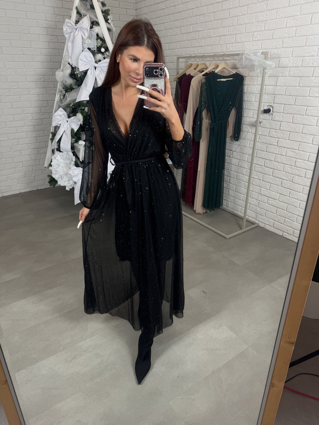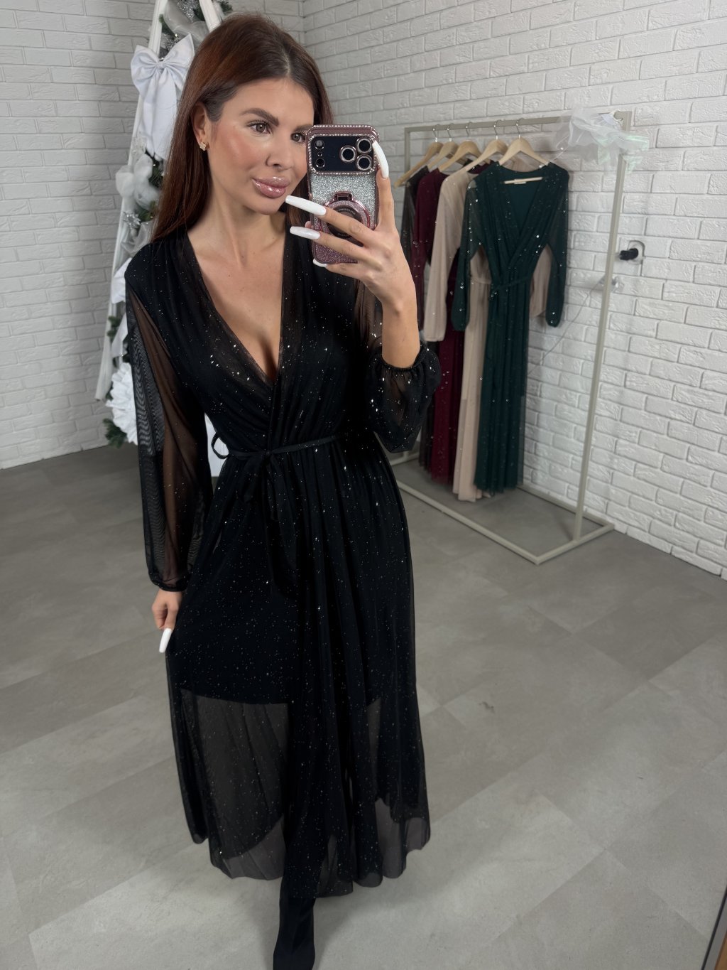 Šaty AVARA dlhé majú voľný trblietavý materiál. Sadnú aj na tehotenské bruško. Sadnú aj na väčšie aj menšie prsia. Vhodné od veľkosti XS po L. Reguľovateľný pás. Šaty majú podsukničku. Reguľovateľný výstrih. Šaty majú áčkový strih a sú v dlhej dĺžke, preto sadnú na postavy do 180cm. Priesvitné, trblietavé rukávy nádherne dotvárajú celkový dojem zo šiat ✨ Ideálne pre vás, ak milujete eleganciu a jemný lesk 💖👗