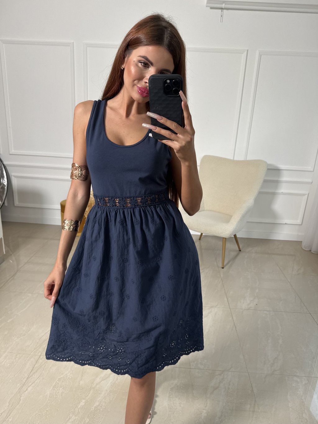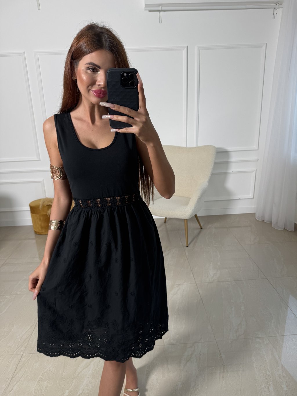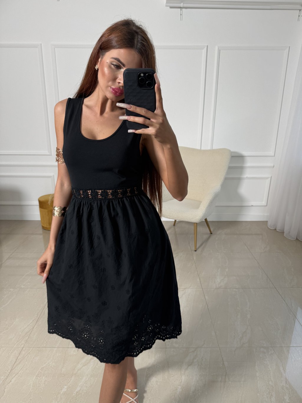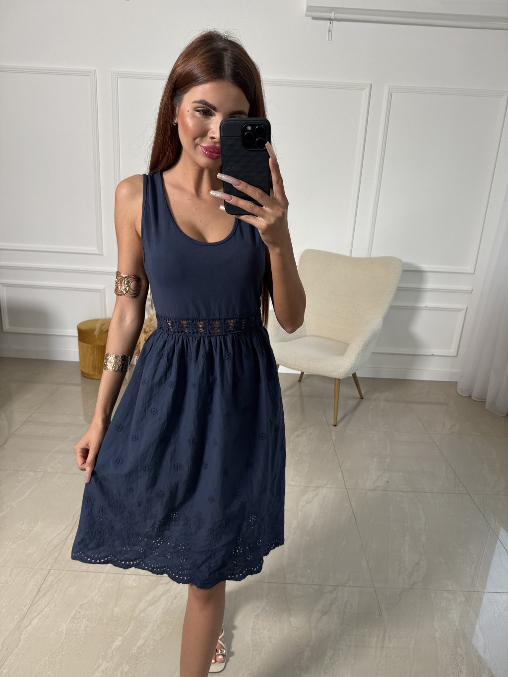 Šaty DENI s dvojdielnym efektom. Suknička má podšívku takže nepresvitá. Suknička je áčkového strihu a sú na nej detaily s kvietkami. Vrchná časť je na ramienka a pod prsiami majú šaty čipkovaný pás. Sú veľmi elastické a vzdušné. Dĺžka je nad kolená, takže sú vhodné na vyššie aj nižšie baby. Sadnú od XS po L.