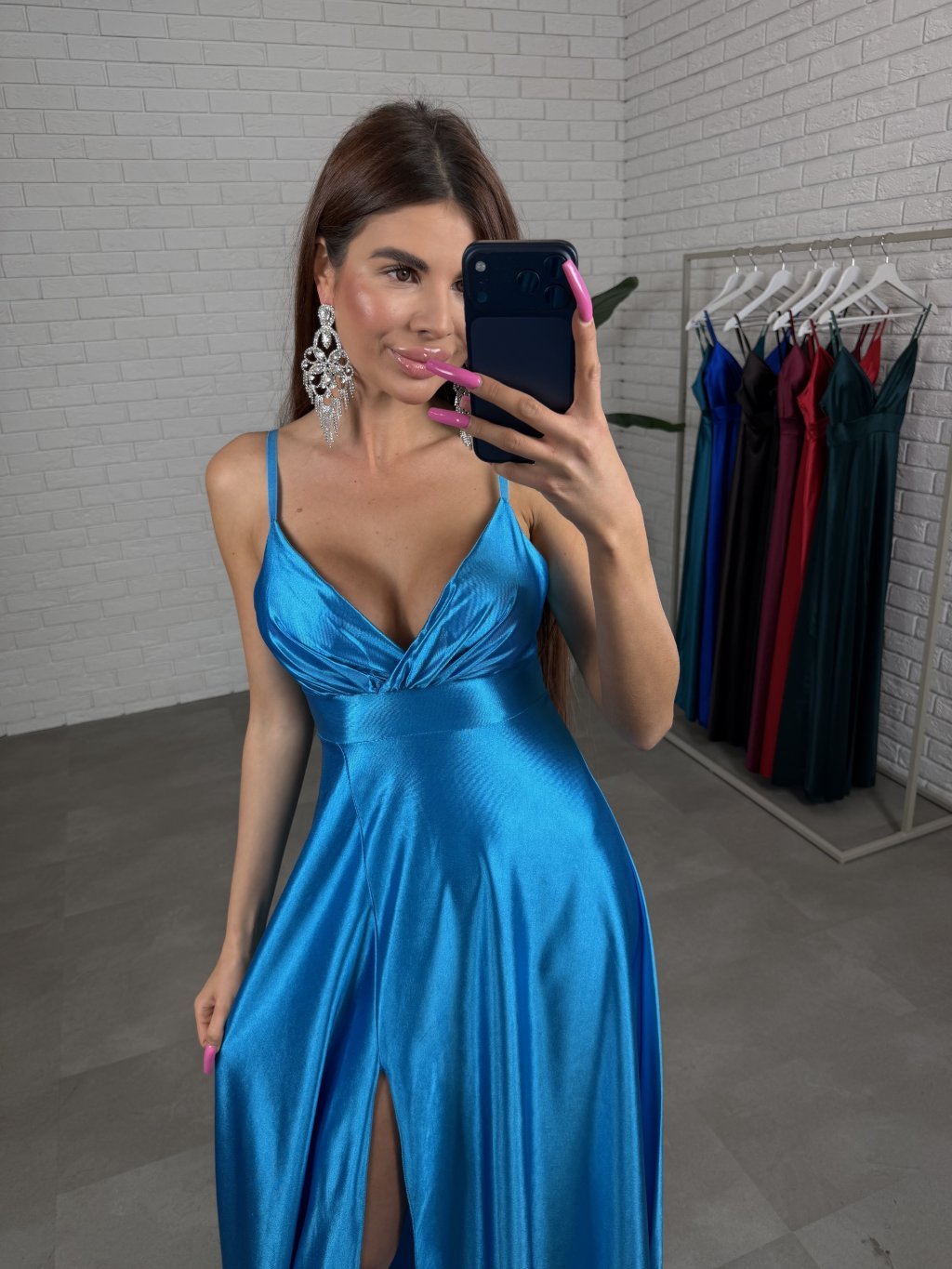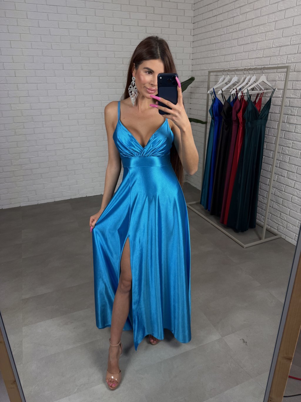 Spoločenské šaty FLORENTÍNA sú ušité z kvalitného saténu v padavom strihu. Sú bohaté na materiál. Horná časť je vystužená v oblasti pŕs, vďaka čomu šaty pekne držia tvar, pričom vzadu je skrytý zips. Sadnú od XS po M a sú vhodné po 180 cm. Ramienka sú regulovateľné.