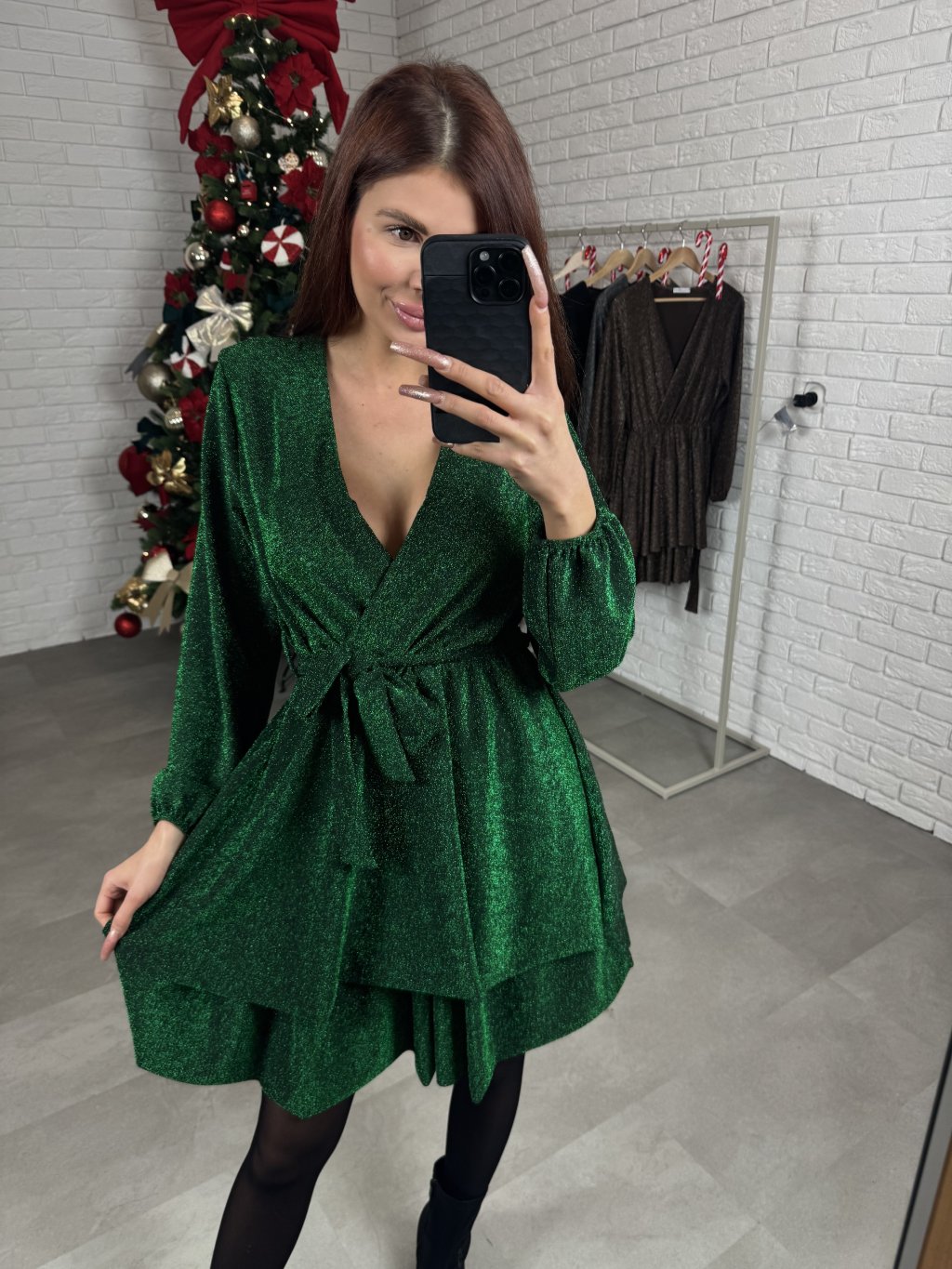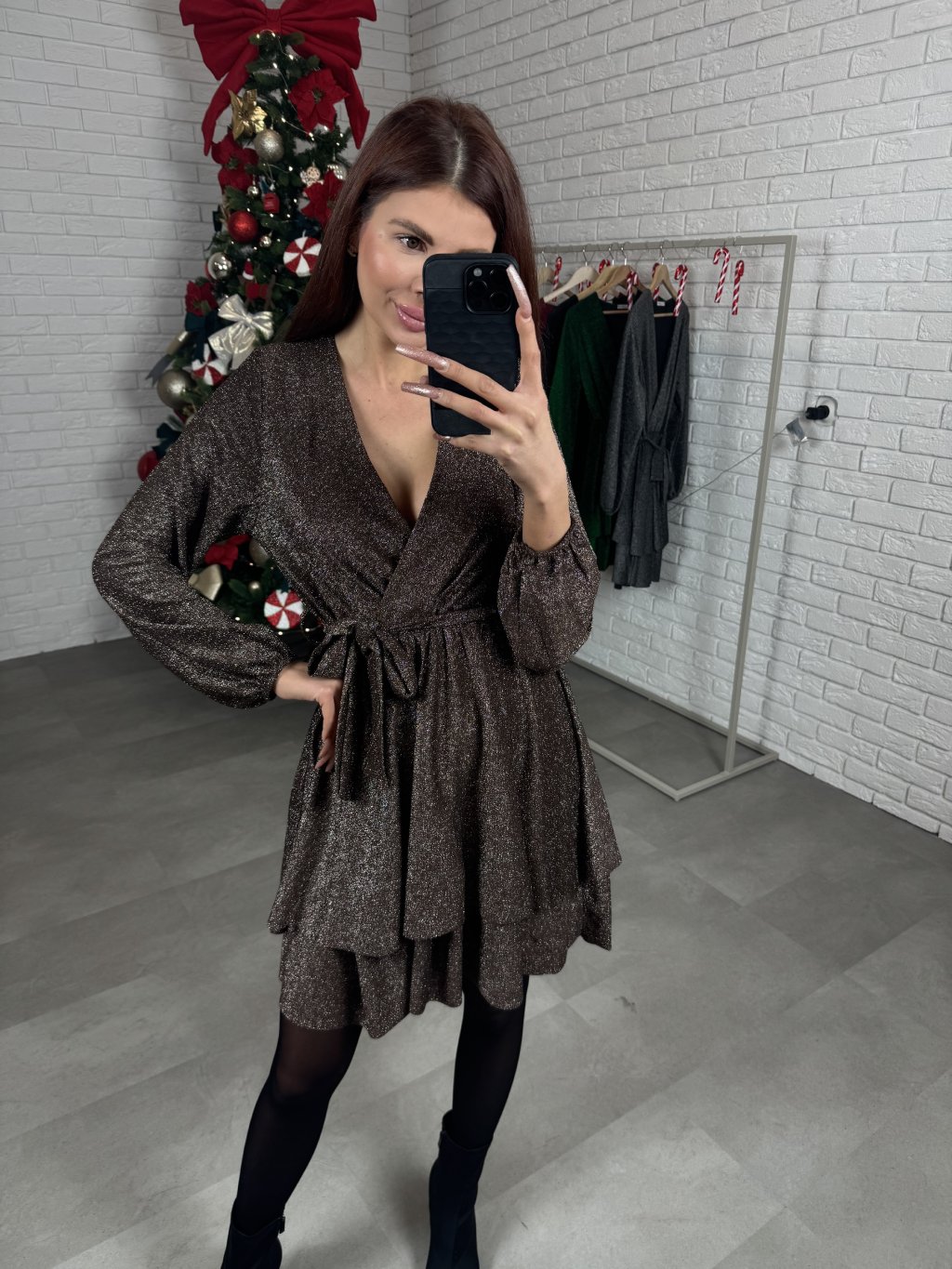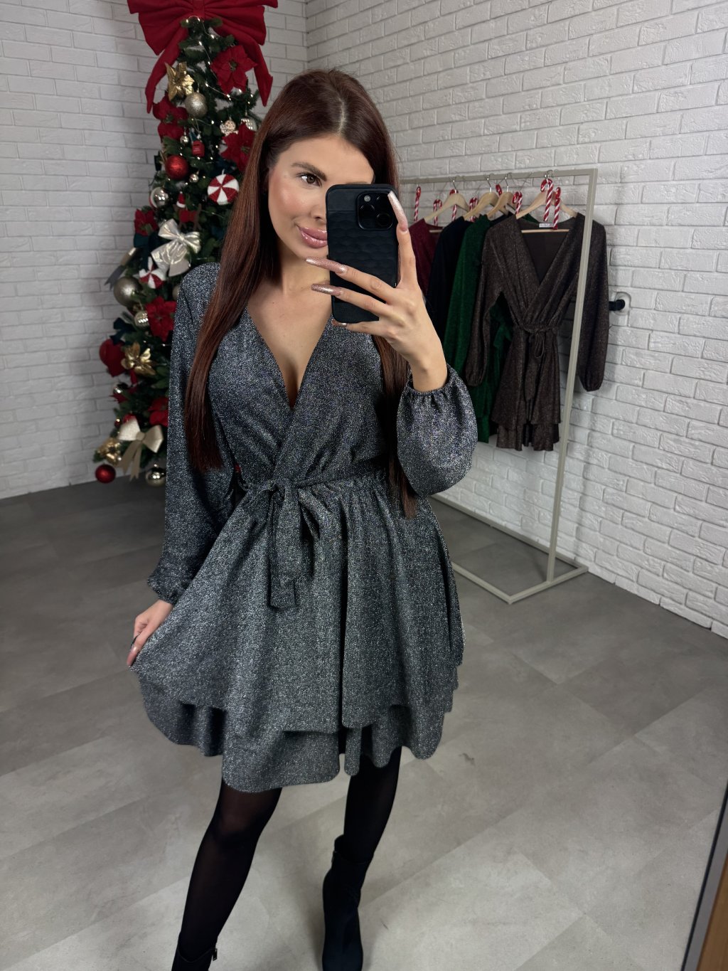 Šaty HANA sú ušité z jemného metalického materiálu, ktorý krásne vyniká vďaka trblietavým nitkám. Majú áčkový strih, ktorý lichotí každej postave a zároveň zakryje prípadné nedokonalosti. Prekladaný, regulovateľný dekolt je vhodný na menšie aj väčšie prsia, čo z nich robí skutočne univerzálny kúsok. V páse je trblietavý opasok, ktorý je súčasťou a pekne dotvorí celkový vzhľad. Kaskádovitá sukňa dodáva šatám jemný ženský vzhľad. Na rukávoch sa nachádza patent. Dĺžka siaha tesne nad kolená a šaty sú vďaka svojmu voľnejšiemu strihu a elastickému materiálu vhodné aj na tehotenské bruško. Sedia od XS po XL.