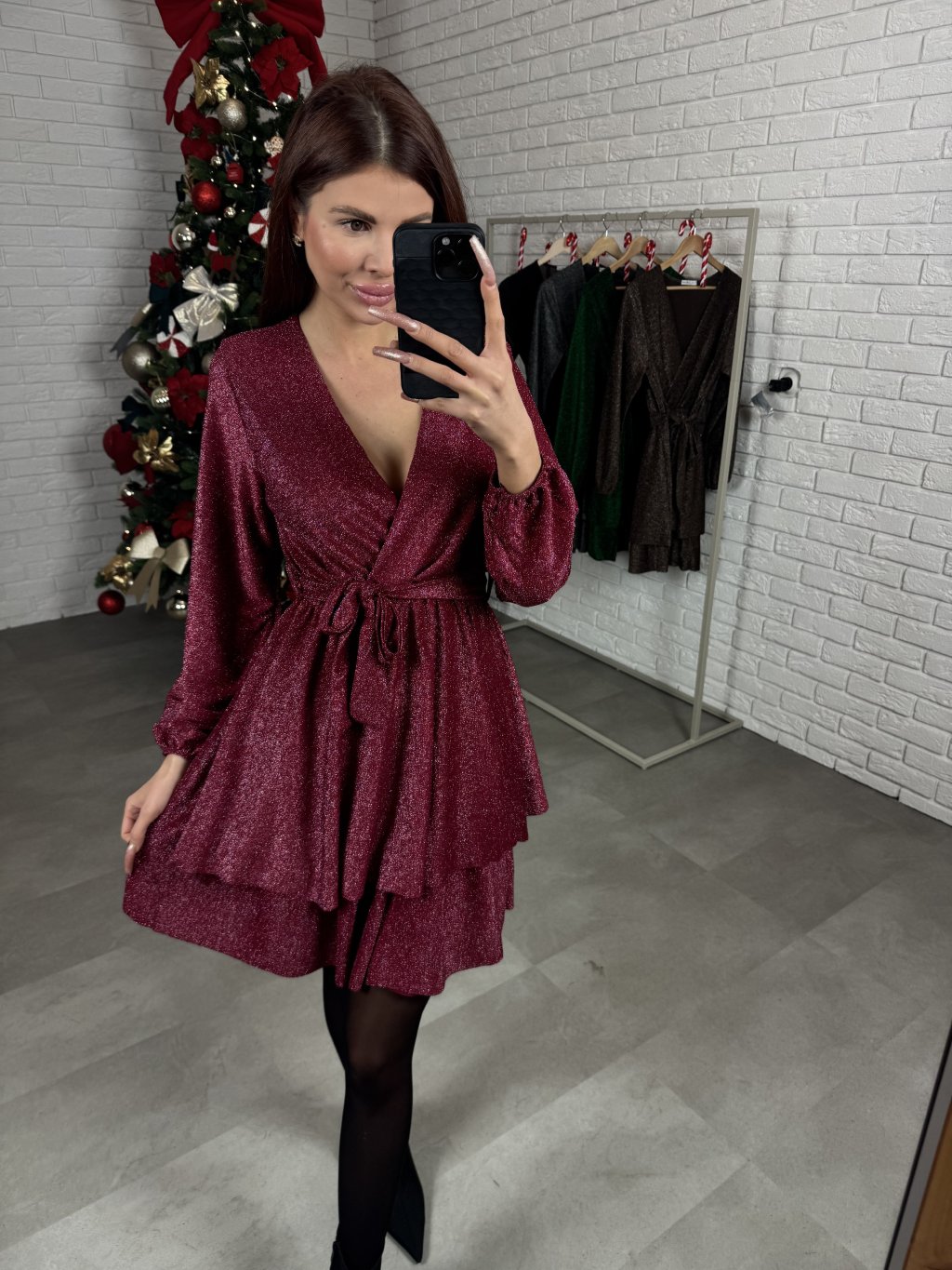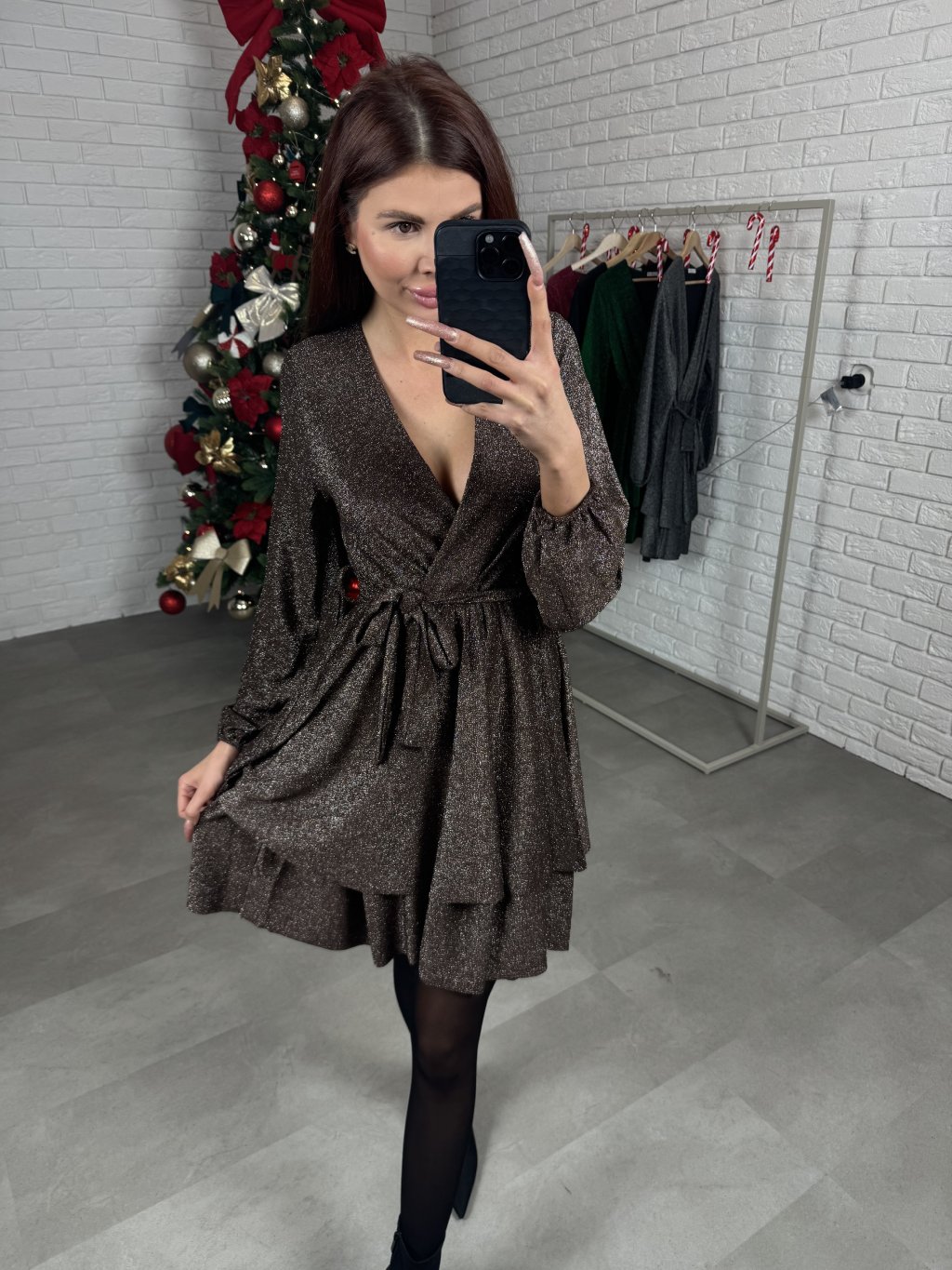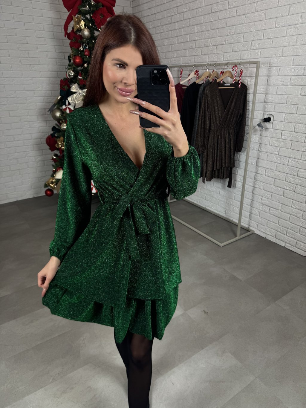 Šaty HANA sú ušité z jemného metalického materiálu, ktorý krásne vyniká vďaka trblietavým nitkám. Majú áčkový strih, ktorý lichotí každej postave a zároveň zakryje prípadné nedokonalosti. Prekladaný, regulovateľný dekolt je vhodný na menšie aj väčšie prsia, čo z nich robí skutočne univerzálny kúsok. V páse je trblietavý opasok, ktorý je súčasťou a pekne dotvorí celkový vzhľad. Kaskádovitá sukňa dodáva šatám jemný ženský vzhľad. Na rukávoch sa nachádza patent. Dĺžka siaha tesne nad kolená a šaty sú vďaka svojmu voľnejšiemu strihu a elastickému materiálu vhodné aj na tehotenské bruško. Sedia od XS po XL.