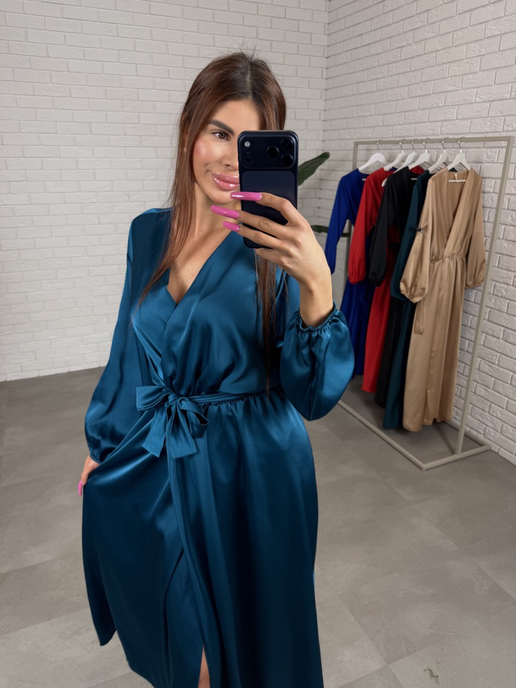 Šaty MARINA sú vhodné pre konfekčné veľkosti od XS až po XL, sú to zavinovacie saténové šaty s možnosťou zaviazania v páse, majú dlhý rukáv ukončený patentom, sú vhodné pre výšku až do 180 cm, vhodné aj na tehotenské bruško, modelka na fotke má 170 cm. Ideálne na rande aj ako plesové šaty.