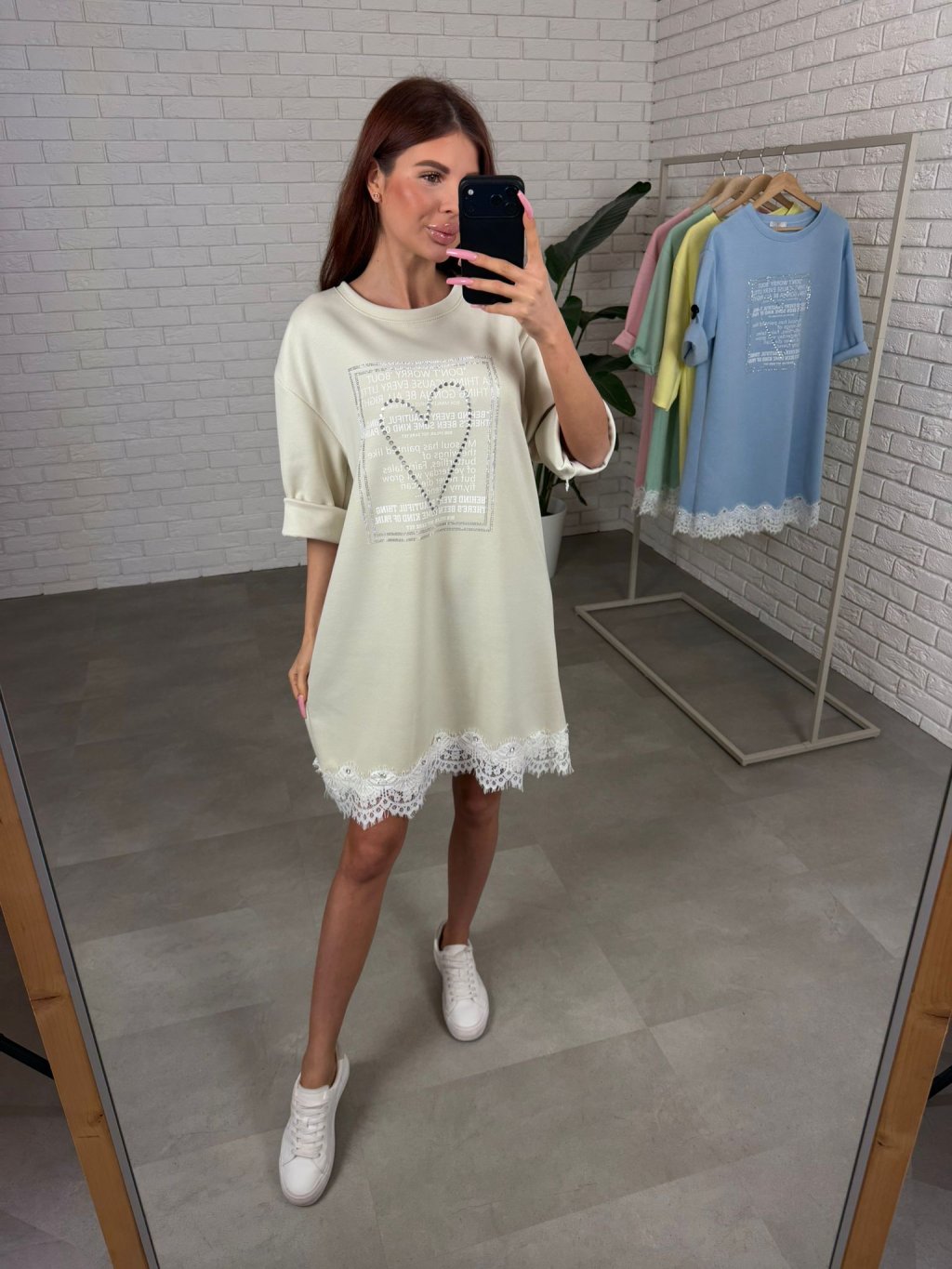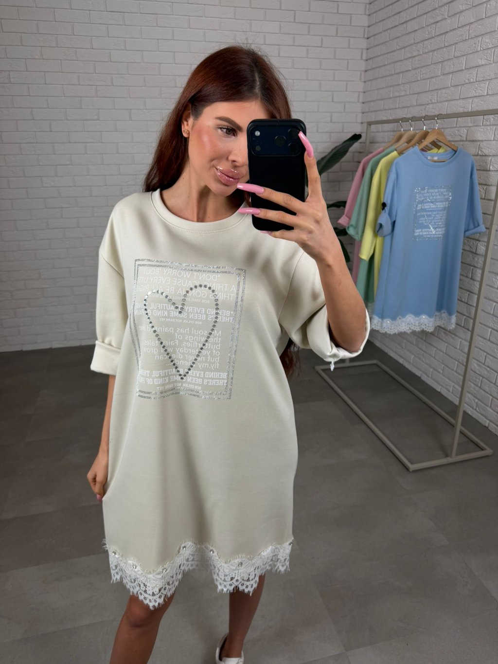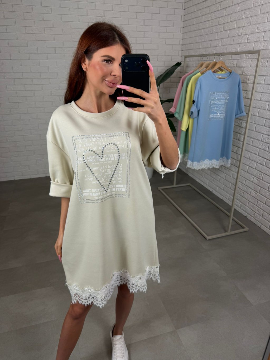 Šaty sú ako stvorené na dni, keď chceš pohodlie, no zároveň nechceš pôsobiť obyčajne. Ušité sú z príjemného poloteplákového materiálu, ktorý sa pekne nosí a ostáva upravený počas celého dňa. Voľnejší strih je skvelý na zakrytie bruška, pása aj bokov, takže sa v nich budeš cítiť komfortne aj v období po pôrode alebo pri tehotenskom brušku. Vpredu zaujmú štrasovým srdiečkom a ozdobnou potlačou, vďaka čomu pôsobia žensky a jemne rozžiaria celý outfit. Rukávy sú dĺžkou po lakeť a spodný okraj je ukončený čipkou s drobnými kamienkami, čo robí zo šiat krásny, nežný kúsok na bežný deň. Veľkostne sadnú od S po XL.