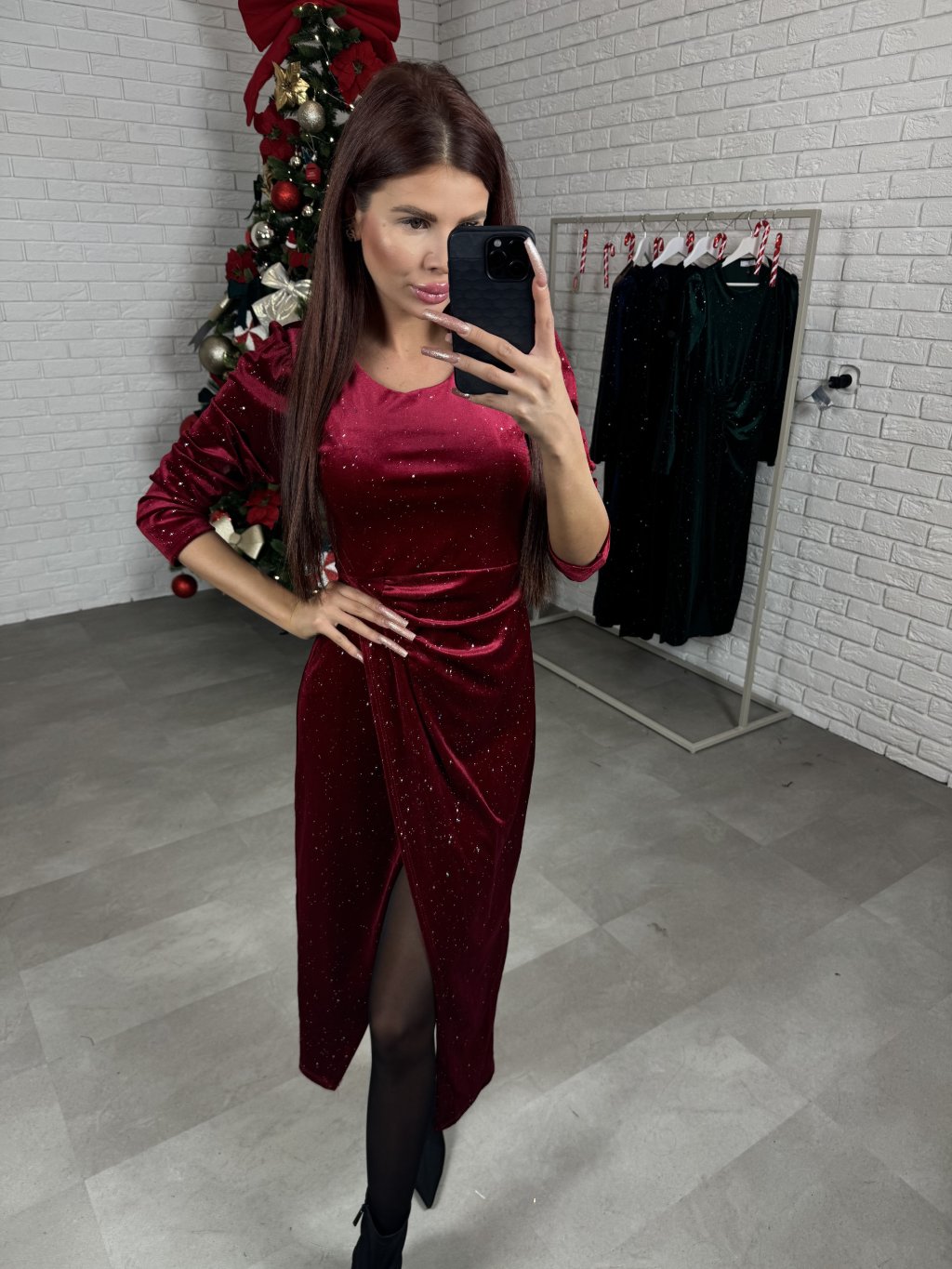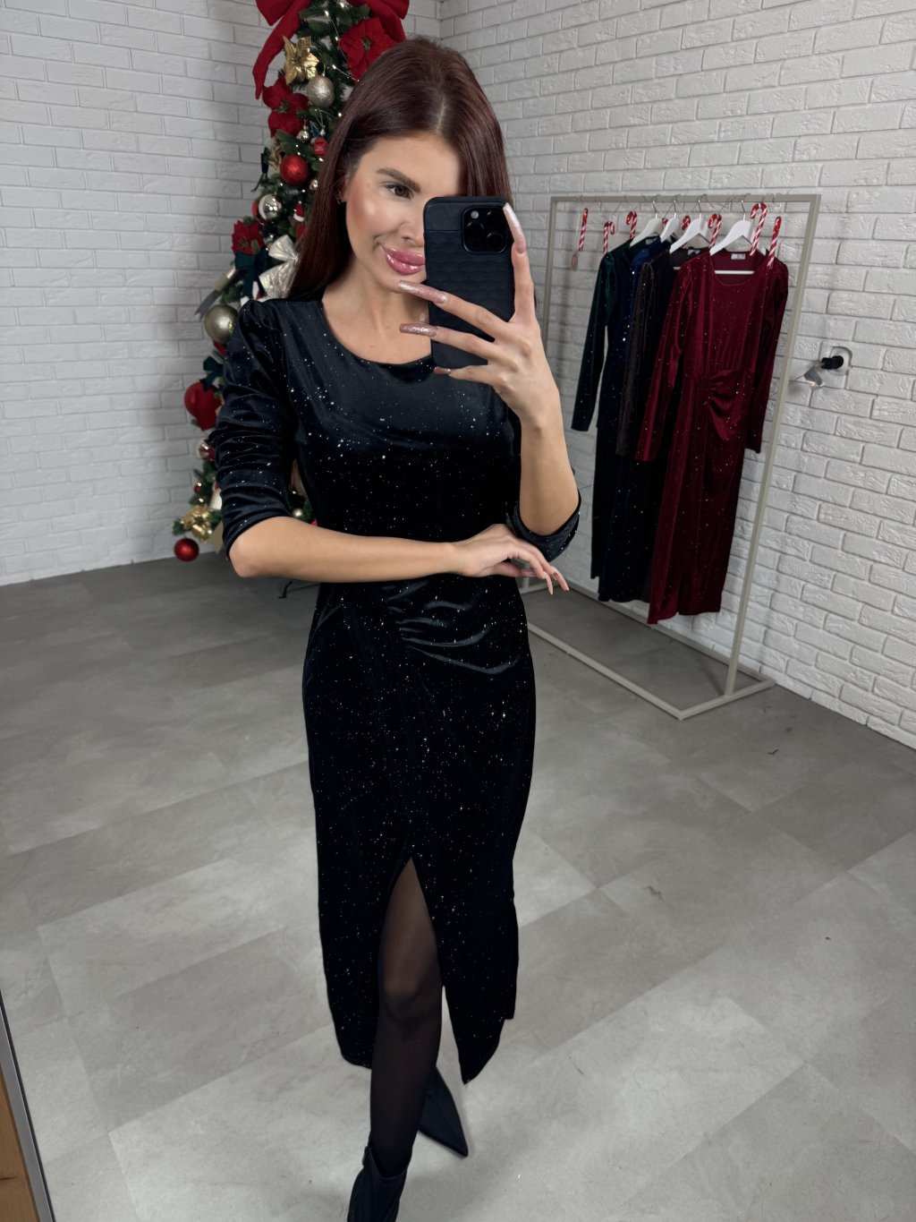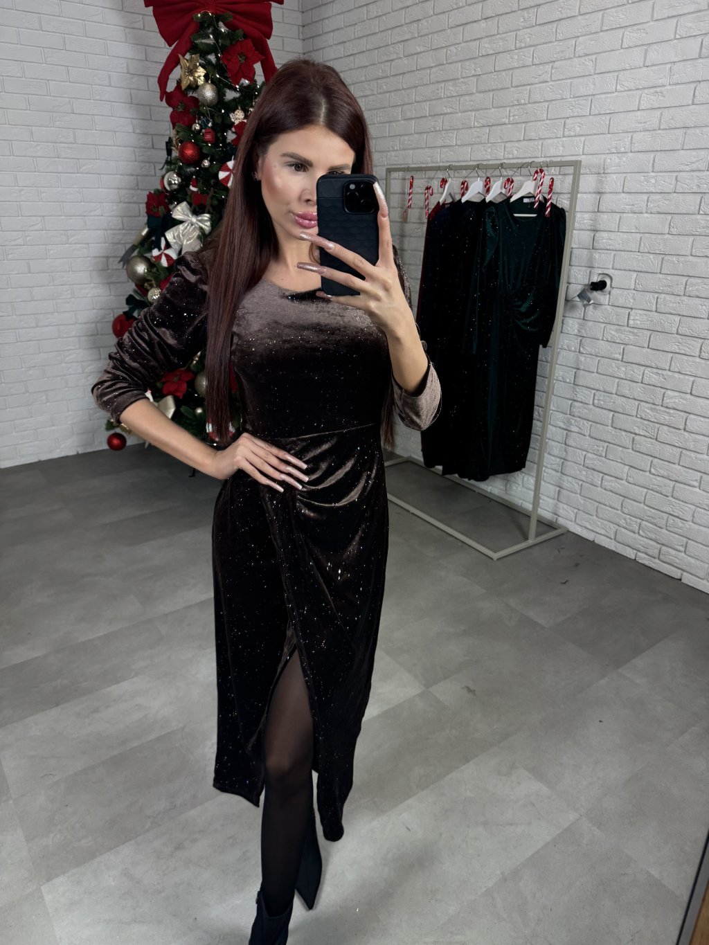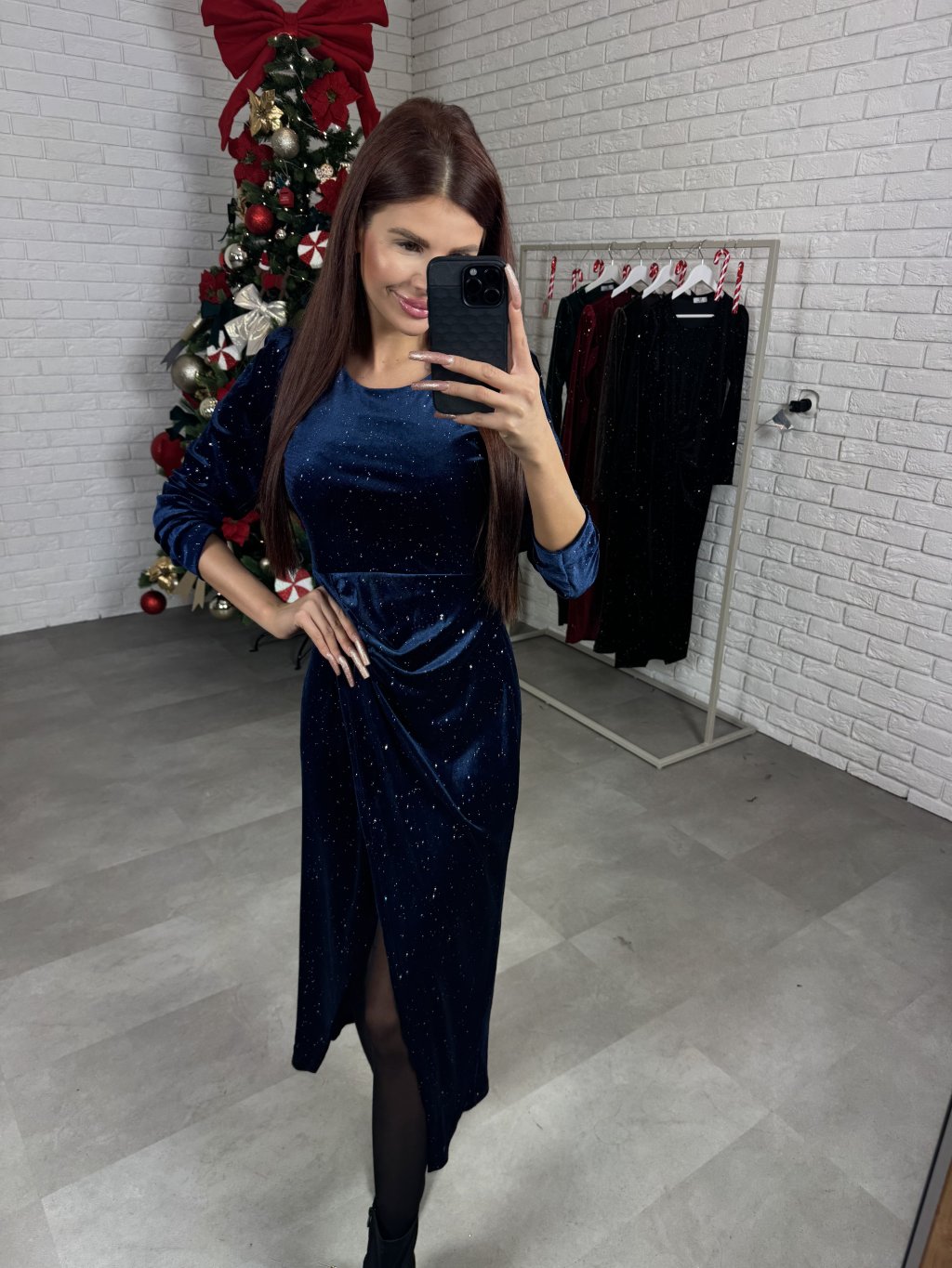 Šaty NARO zo zamatového materiálu so zapracovanými trblietkami priamo v látke. Sadnú od XS po L. Elastický materiál, v midi dĺžke vhodný aj pre vyššie dievčatá (do výšky cca 180 cm). Rozparok sa nachádza na pravej strane. Prekladaná látka cez bruško zakryje prípadné nedokonalosti a trblietkami prežiarený materiál dodáva šatám elegantný, žiarivý vzhľad.
